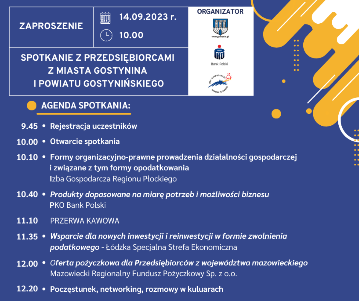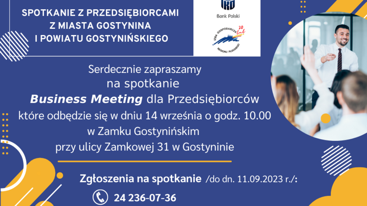 W imieniu organizatorów: Pawła Kalinowskiego Burmistrza Miasta Gostynina, Magdaleny Cichosz Dyrektora PKO Bank Polski Oddz. Gostynin, Renaty Dąbrowskiej-Pasterkiewicz Prezesa Izby Gospodarczej Regionu Płockiego serdecznie zapraszamy przedsiębiorców z powiatu gostynińskiego i płockiego na spotkanie Business Meeting, podczas którego zostaną omówione m.in. formy organizacyjno-prawne prowadzenia działalności gospodarczej i związane z tym opodatkowanie.