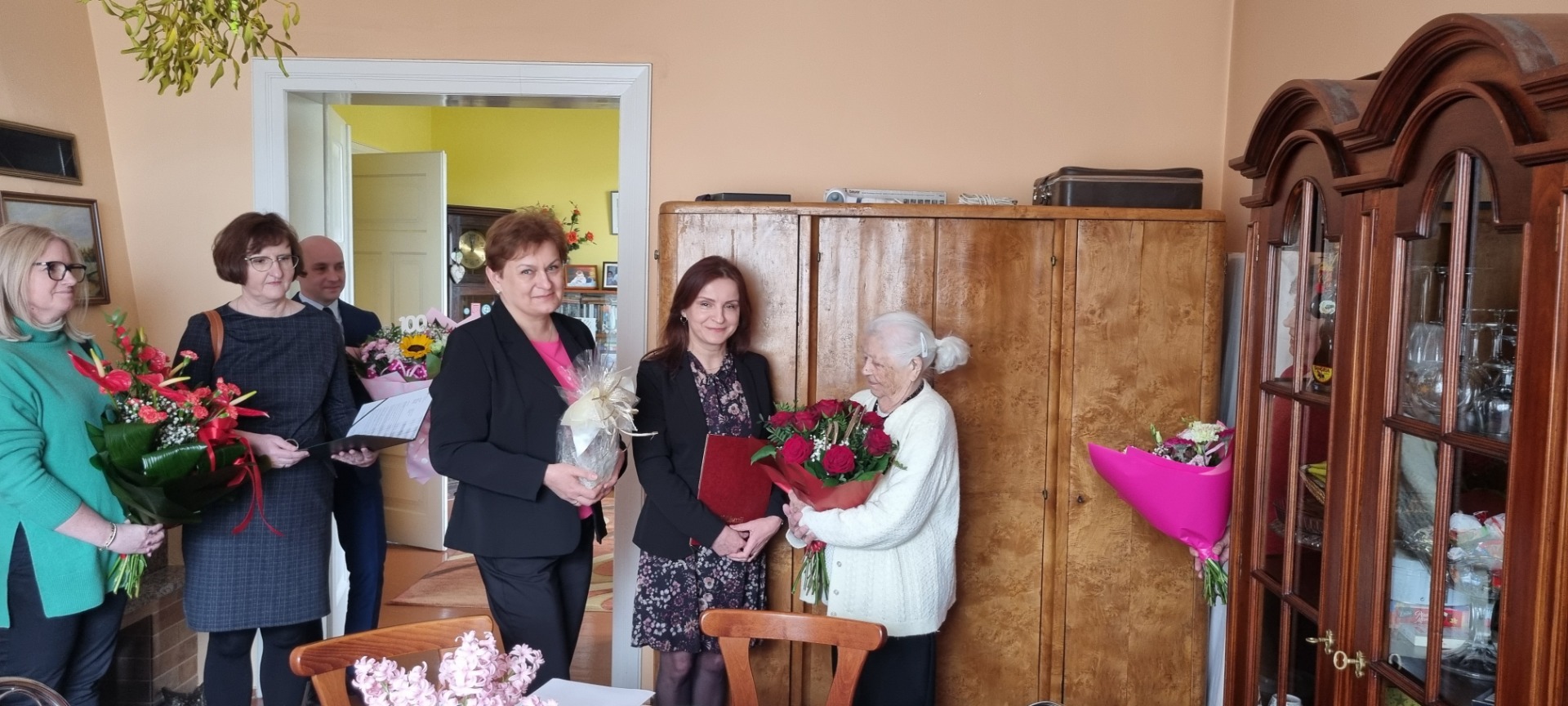 W naszej Gminie tak niecodzienne i doniosłe uroczystości zdarzają się niezwykle rzadko. Z tej okazji dostojną Jubilatkę odwiedziła Wójt Gminy Gostynin – Renata Kędzierska wraz z Kierownikiem Referatu Spraw Obywatelskich – Małgorzatą Ziółkowską, Kierownik Delegatury Mazowieckiego Urzędu Wojewódzkiego w Płocku – Bogdan Banaszczak, delegacja z Placówki Terenowej ZUS: Naczelnik Wydziału Świadczeń Emerytalno – Rentowych – Agata Bieńkowska wraz z Elżbietą Kowalską oraz Kierownik Urzędu Stanu Cywilnego – Marcin Gawinowski.