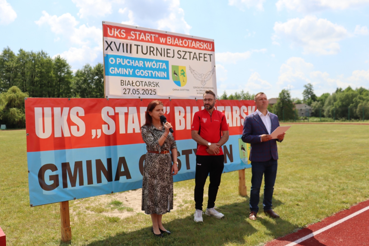 Dyrektor Szkoły Paweł Pilichowicz oraz prezes UKS “START” Lucjan Lewandowski powitali przybyłych na wydarzenie: Wójt Gminy Gostynin - Renatę Kedzierską, Starostę Gostynińskiego - Andrzeja Krzewickiego, zawodniczki i zawodników z ośmiu szkół gminnych wraz z opiekunami, społeczność szkolną oraz służby medyczne - Świat Zdrowia Centrum Medyczne, które czuwały nad bezpieczeństwem uczestników.