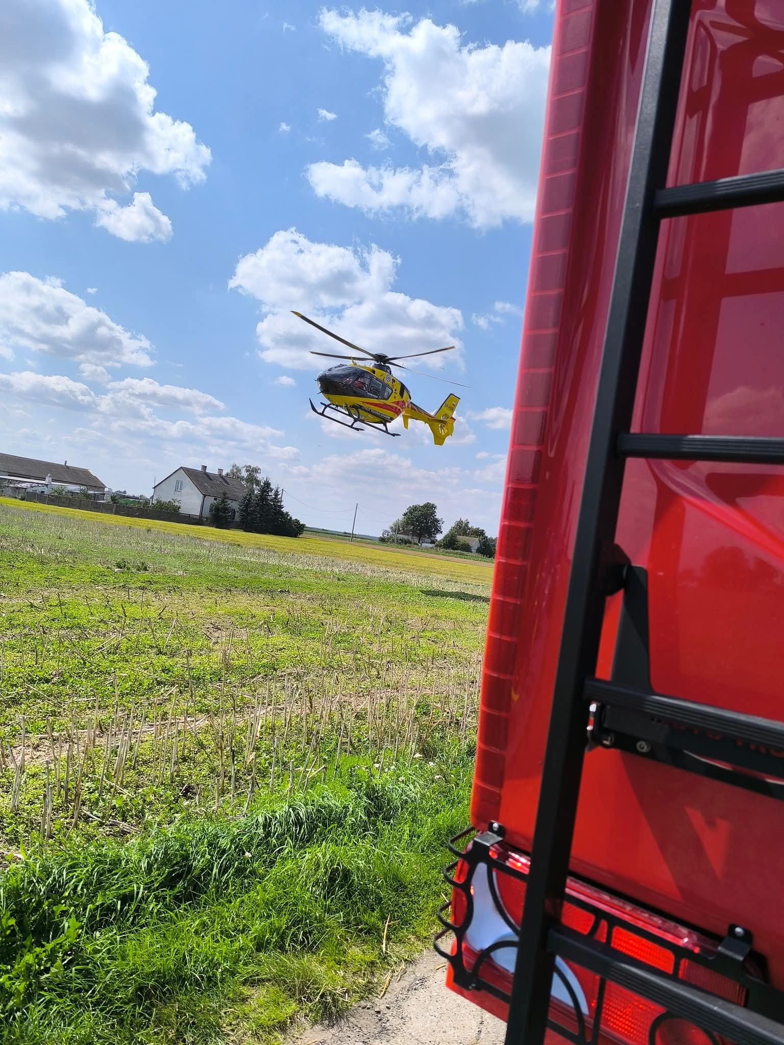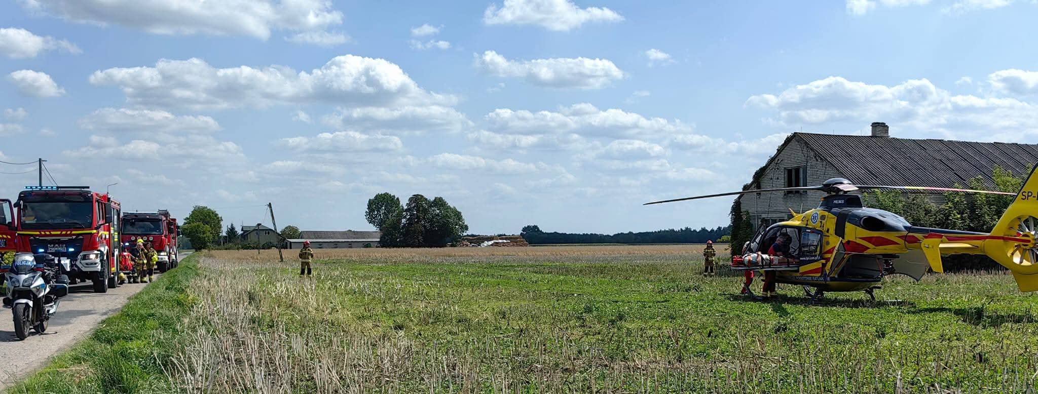 Poszkodowany 65-letni mieszkaniec gminy, w trakcie prowadzonych prac gospodarczych, został przygnieciony przez ciężki worek typu "big bag", w którym urwało się "ucho". Mężczyzna został przetransportowany śmigłowcem do szpitala.