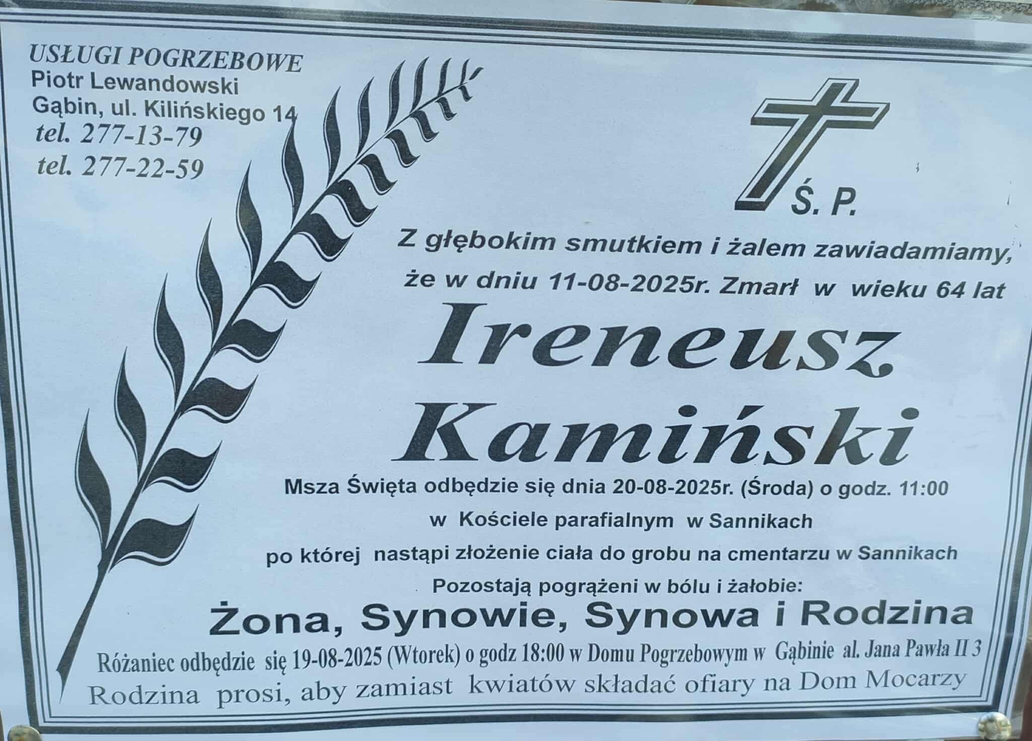 Uroczystości pogrzebowe odbędą się w środę, 20 sierpnia 2025 roku o godzinie 11:00 w kościele parafialnym w Sannikach.