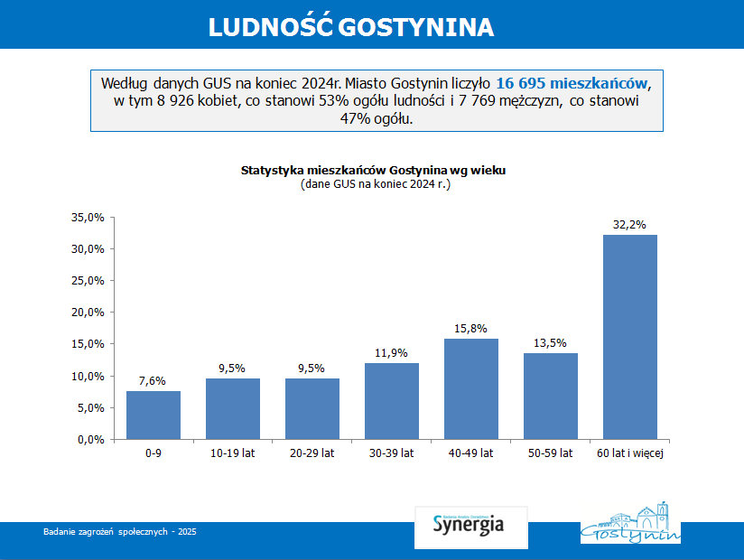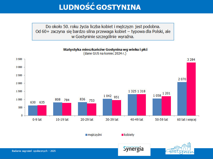 Gostynin jest miastem starzejącym się, z wyraźnym odpływem młodych ludzi i przewagą seniorów (zwłaszcza kobiet). Miasto stoi przed wyzwaniem rosnącej liczby seniorów, co wymaga rozbudowy opieki zdrowotnej, usług opiekuńczych, programów aktywizacji i dostosowania przestrzeni miejskiej do potrzeb osób starszych.