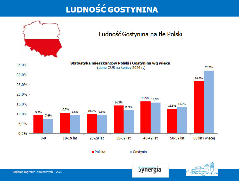 Analizując dane ludności Gostynina w odniesieniu do całej Polski, mamy następujące obserwacje: