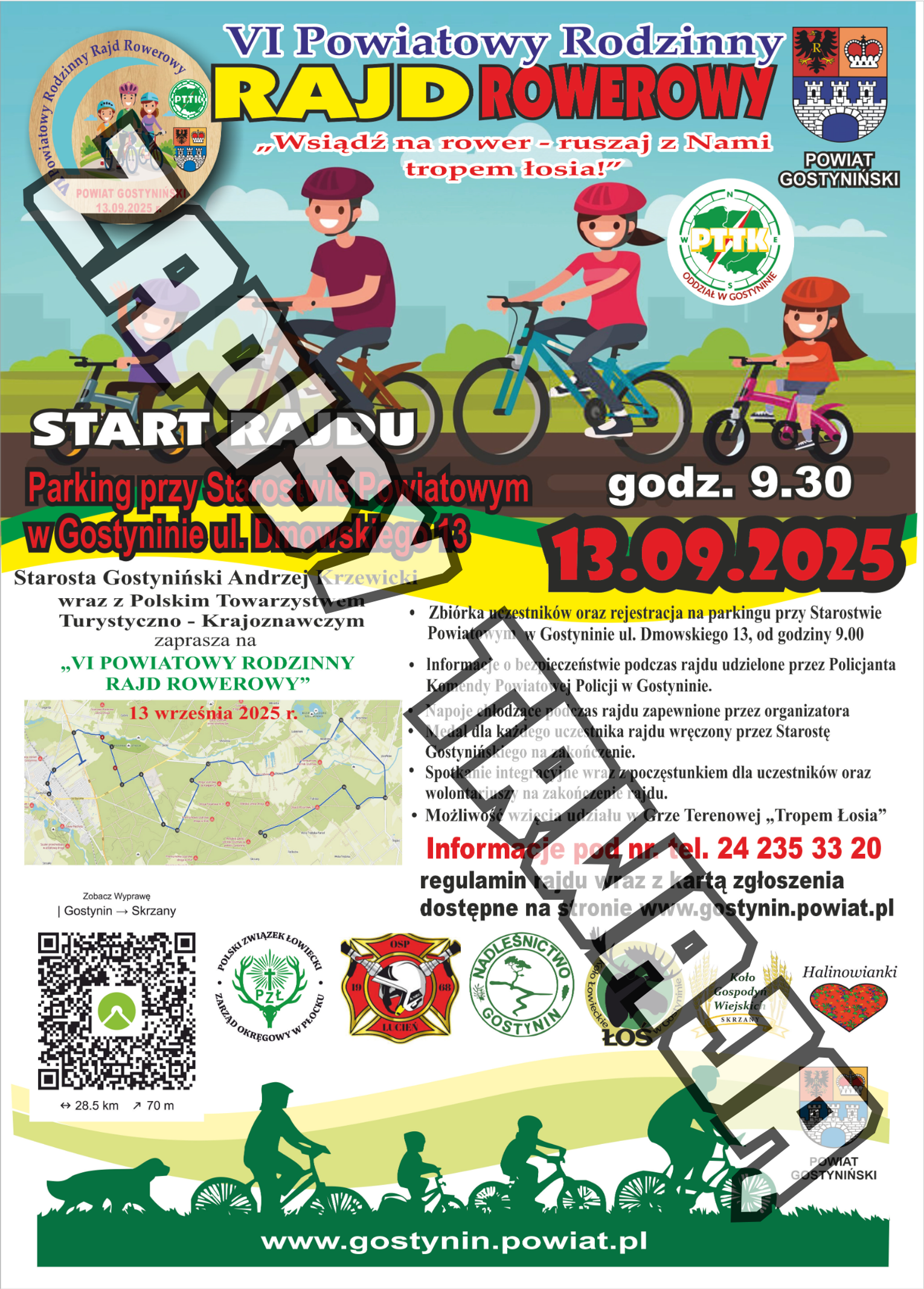 Rajd rozpocznie się o godzinie 9:30 z parkingu przy Starostwie Powiatowym (ul. Dmowskiego 13). Uczestnicy będą mogli nie tylko cieszyć się jazdą na rowerze, lecz także korzystać z dodatkowych atrakcji, takich jak porady dotyczące bezpieczeństwa udzielane przez policjantów z Komendy Powiatowej Policji w Gostyninie.
