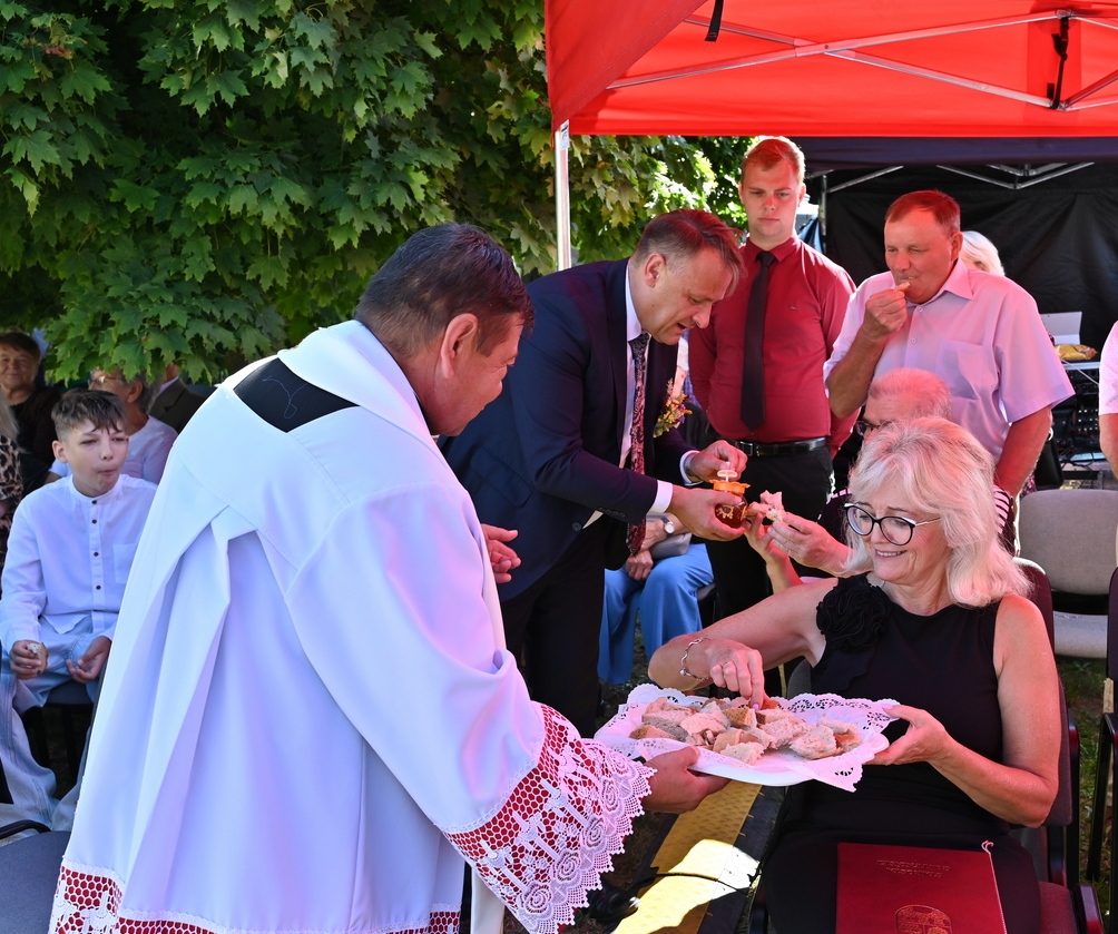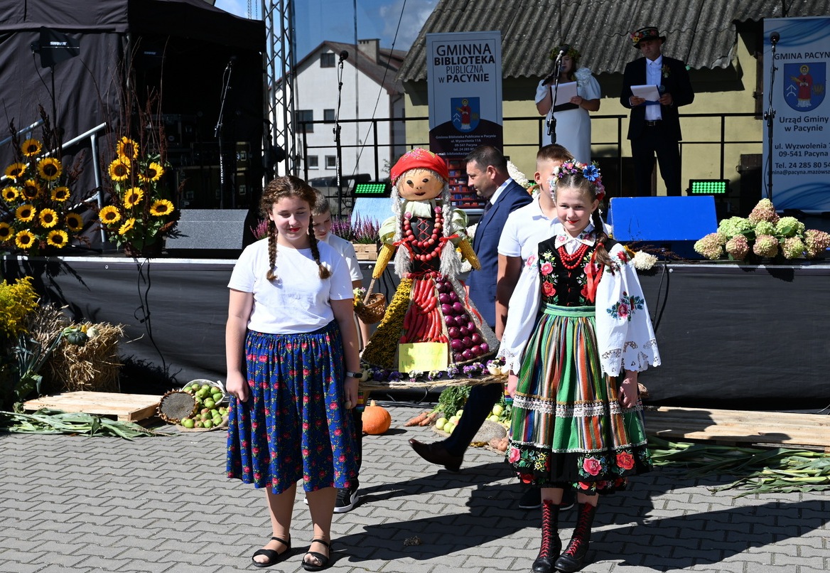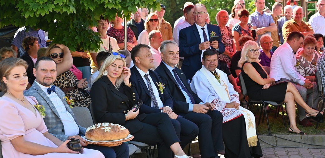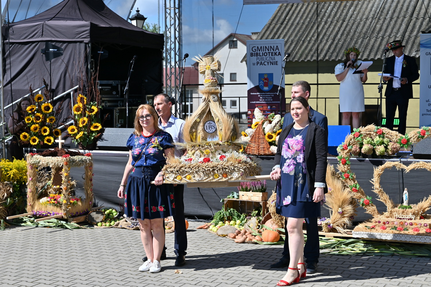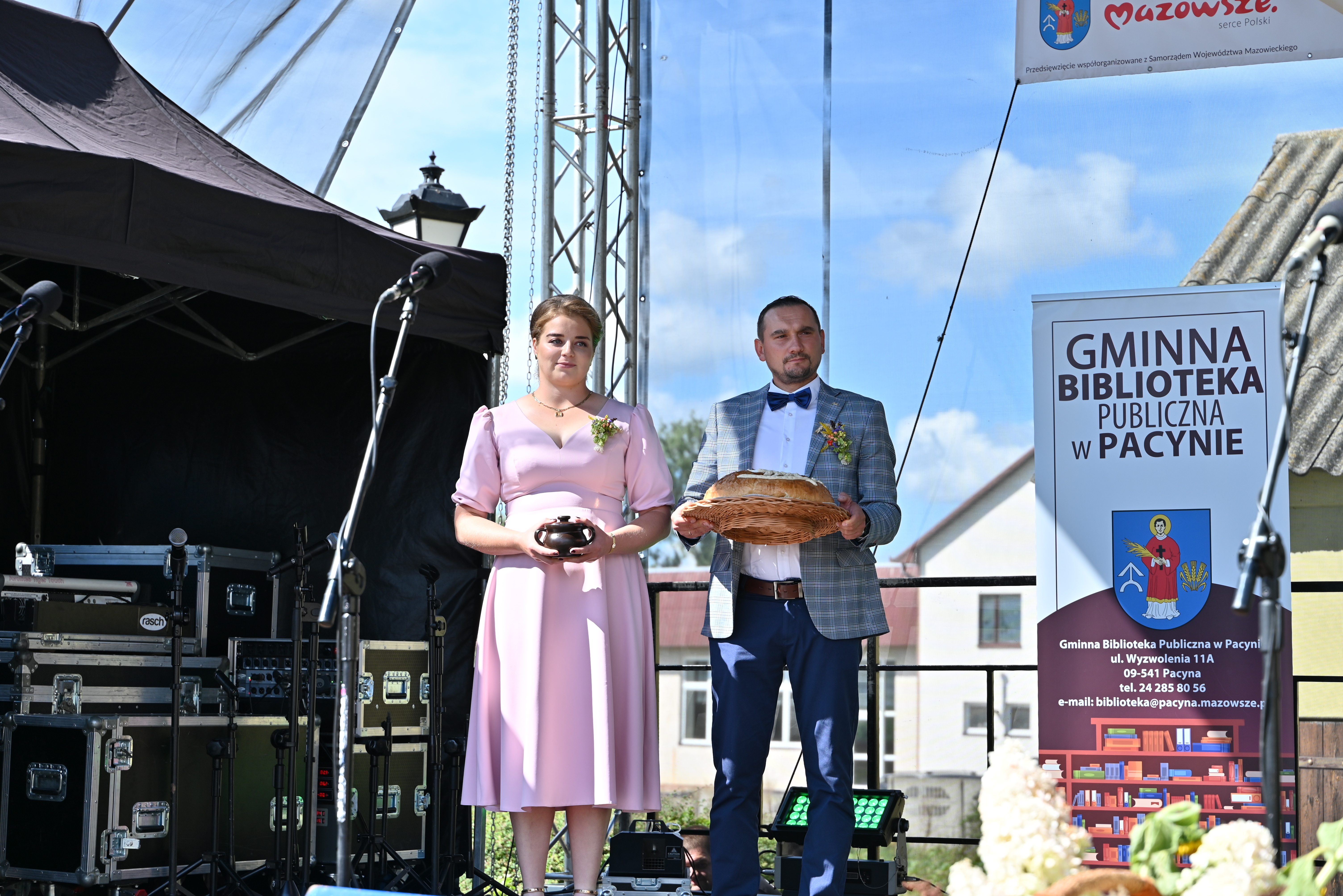 O godzinie 12.00 została odprawiona Msza Święta dziękczynna za tegoroczne plony. Po mszy wszyscy w barwnym korowodzie przeszli na plac obok kościoła, gdzie miała miejsce druga część dożynek. Podczas uroczystości odbył się tradycyjny ceremoniał przekazania chleba i miodu. Starostowie wręczyli bochen chleba upieczony z tegorocznych zbiorów oraz miód od lokalnych pszczelarzy Gospodarzom Dożynek, czyli Wójtowi Gminy Pacyna Tomaszowi Klimczakowi i proboszczowi parafii Pacyna ks. Zbigniewowi Ciechomskiemu. Po obrzędzie chleb został pokrojony i podzielony wśród wszystkich uczestników dożynek. Chleb na tę uroczystość upiekła Piekarnia Pacyna Piotr Majewski, a pyszny miód podarowali Andrzej Adamczyk oraz Renata Walczak.