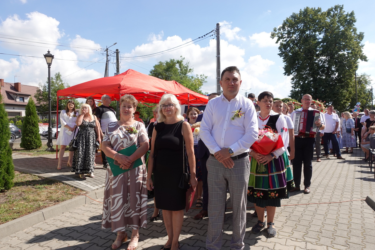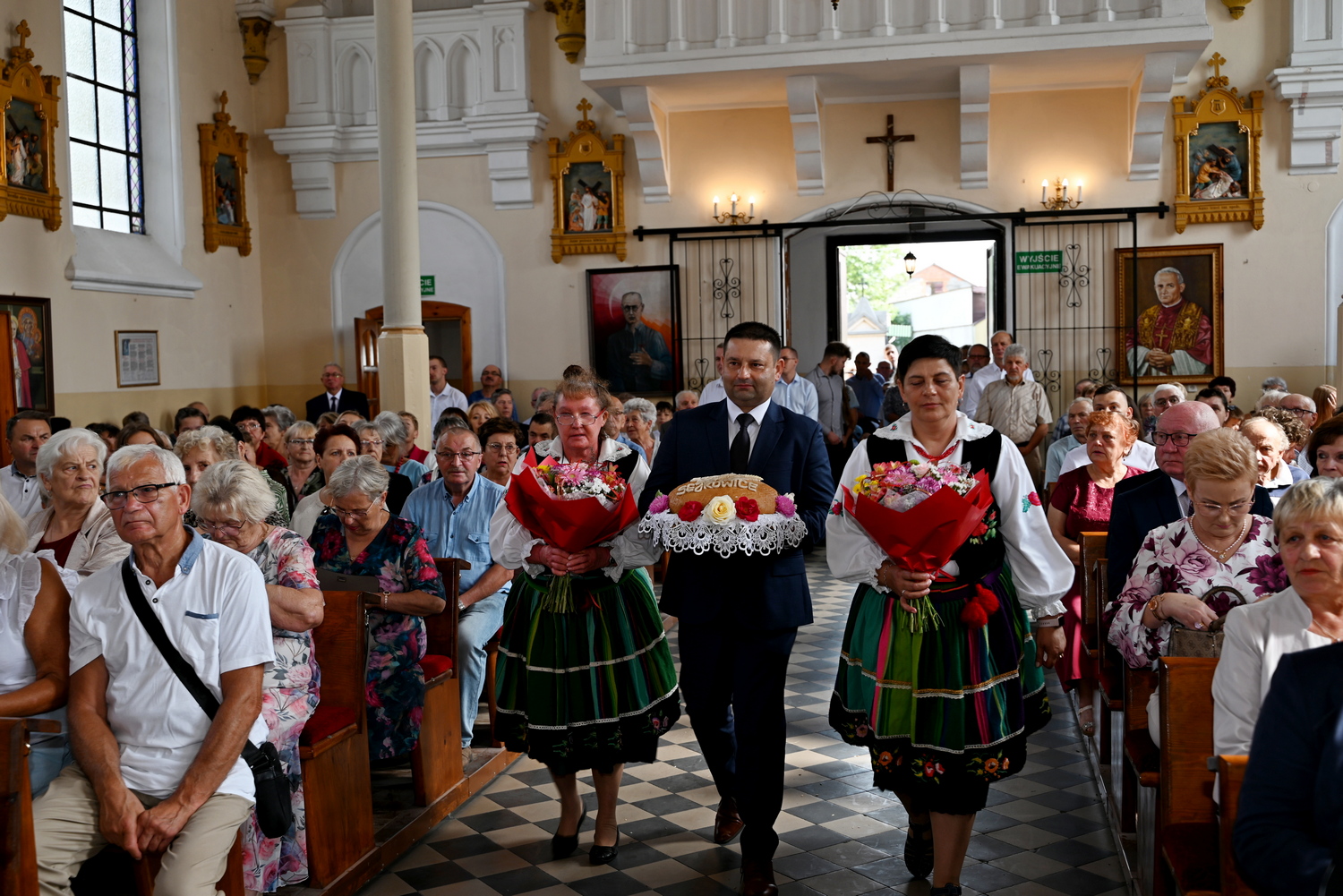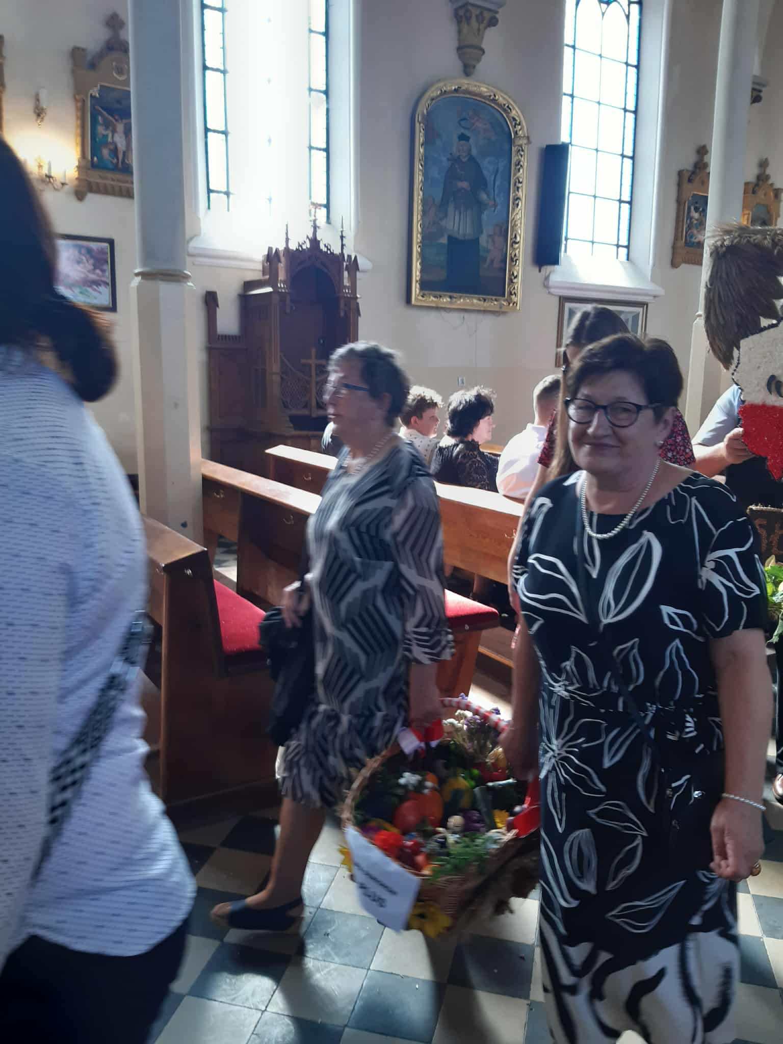 Prowadzący przedstawiali każdy wieniec i mieszkańców je niosących. Wieńce i kosze dożynkowe były imponujące, zadziwiały pomysłowością i kreatywnością wykonawców.