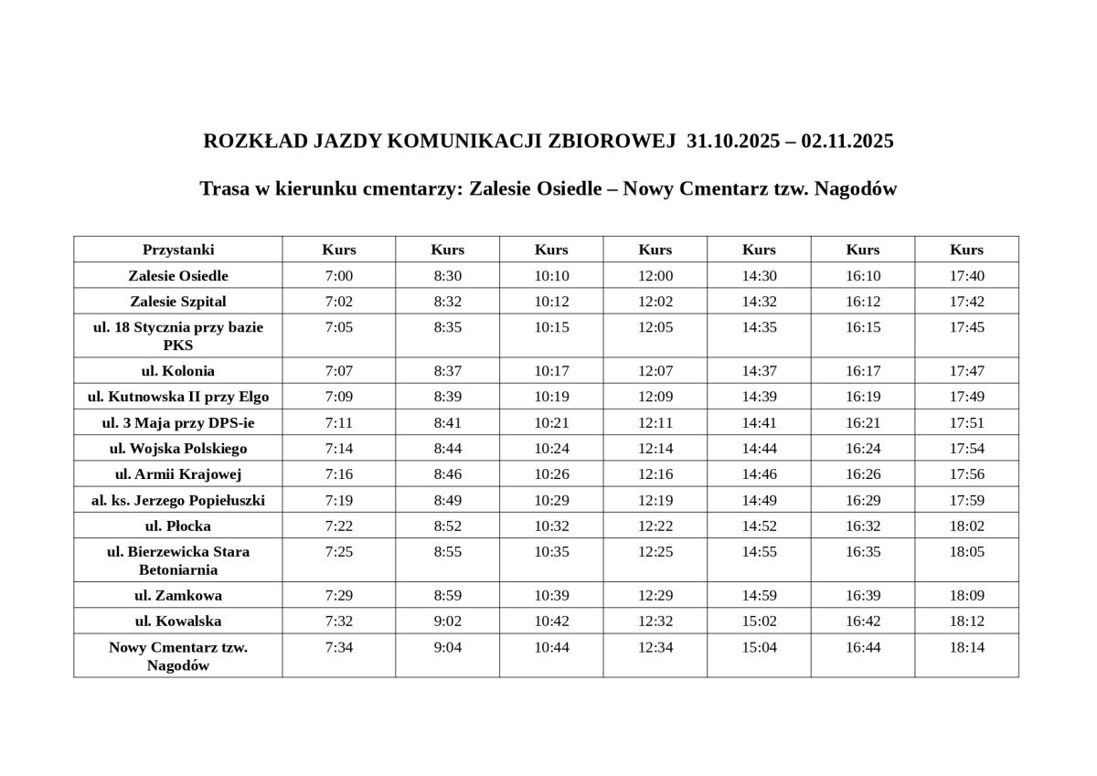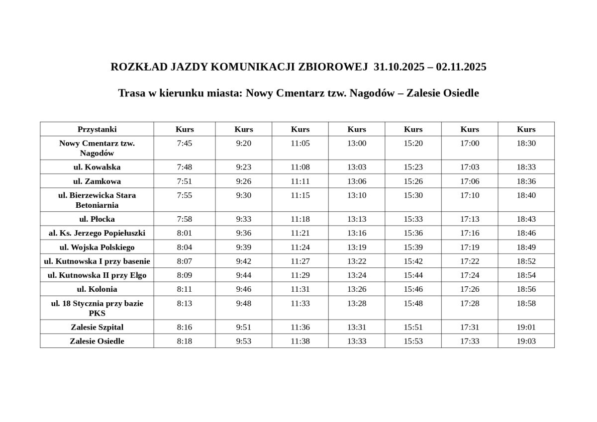- Trasa: Pojazdy będą kursować na linii od Zalesia do cmentarza w Nagodowie (przy ul. Kowalskiej). Cała usługa świadczona jest nieodpłatnie dla wszystkich pasażerów.