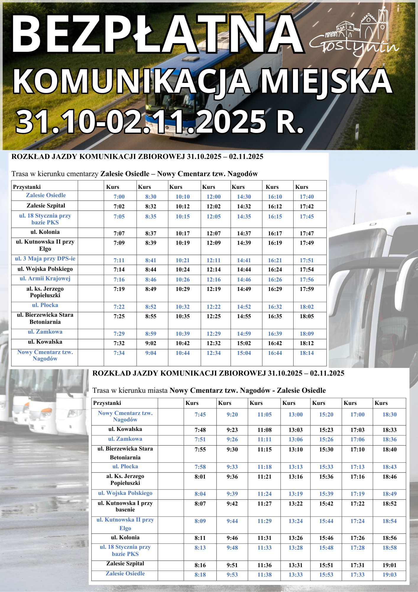 Władze Miasta Gostynina zachęcają do korzystania z darmowej komunikacji, apelując jednocześnie o rozwagę i unikanie nadmiernego ruchu samochodowego wokół cmentarzy.