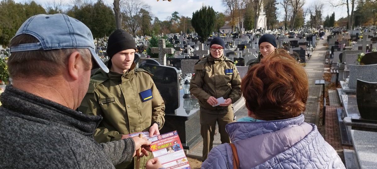 Po części historycznej uczniowie wraz z policjantami rozdawali materiały informacyjne dotyczące najczęstszych metod oszustw, m.in. „na wnuczka” czy „na policjanta”. W ten sposób uczniowie mogli w praktyce poznawać elementy służby prewencyjnej oraz znaczenie działań profilaktycznych w codziennej pracy policji.