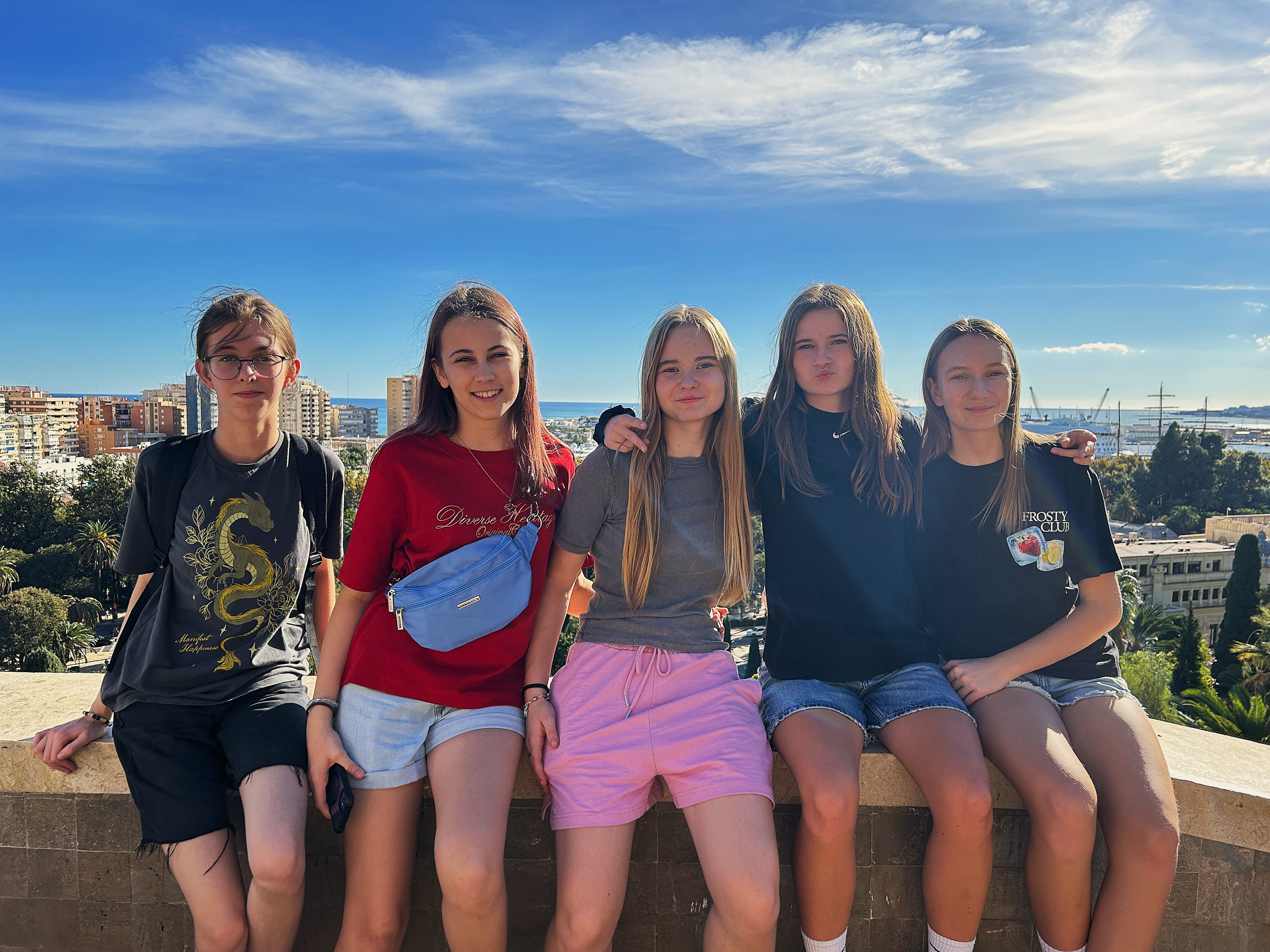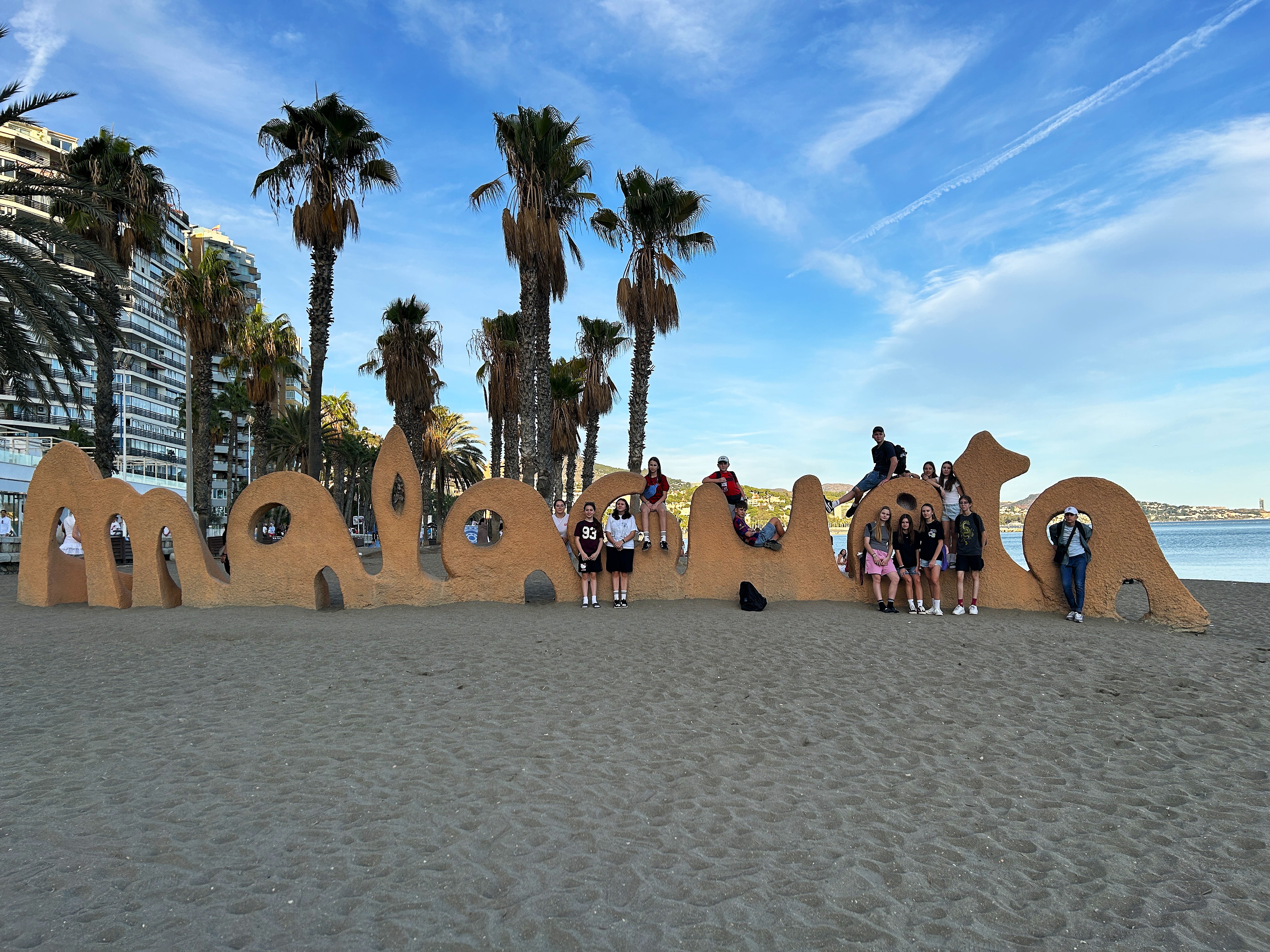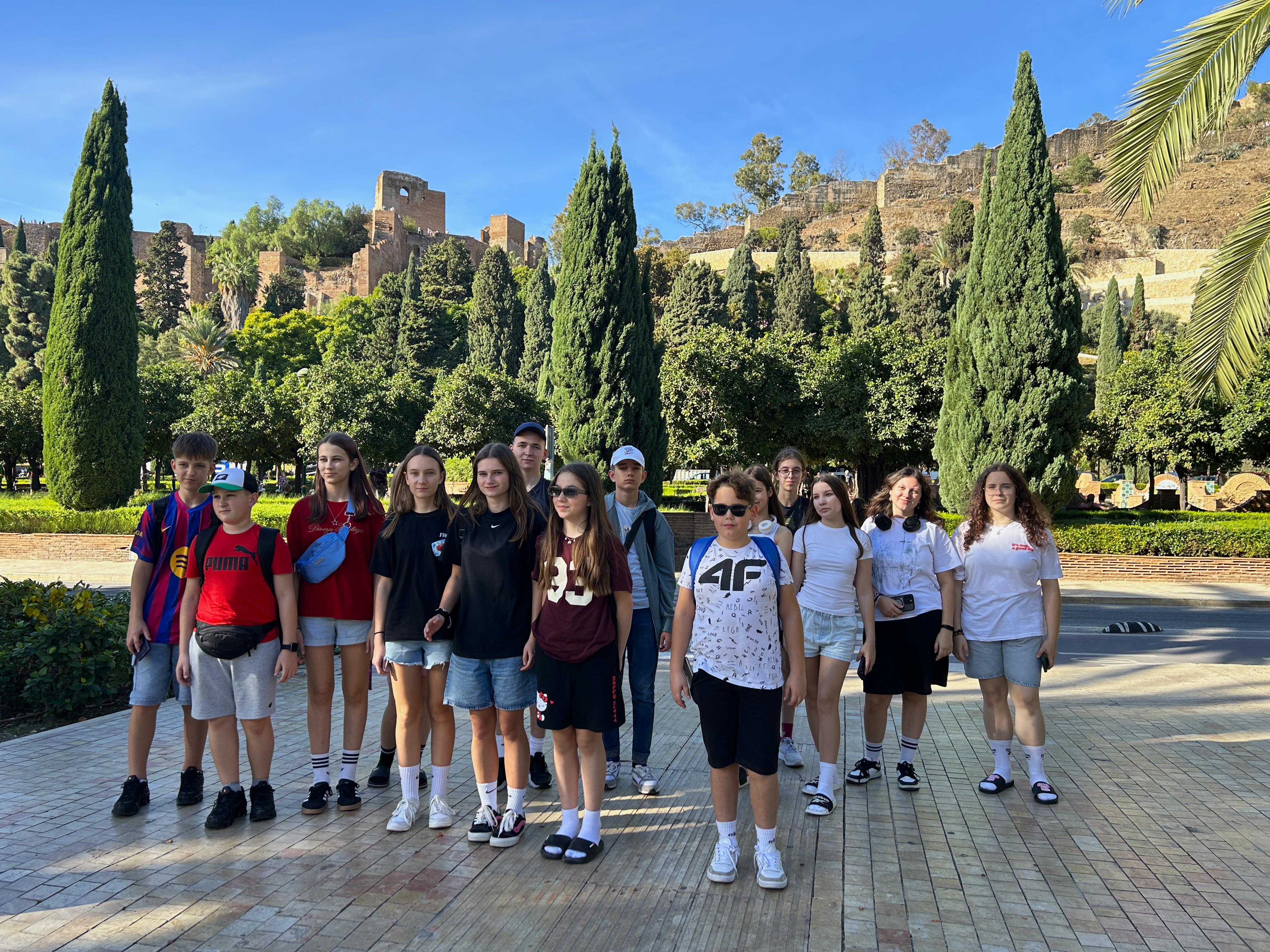 Już pierwszego dnia rozpoczęto zwiedzanie miasta. Uczniowie przeszli przez artystyczną dzielnicę Soho, znaną z kolorowych murali i street artu, a następnie dotarli na promenadę Muelle Uno, gdzie cumowały luksusowe jachty oraz statki wycieczkowe. Mijając nowoczesne Centre Pompidou – Muzeum Sztuki Współczesnej i pełne zapachu róż ogrody, grupa weszła na wzgórze Castillo de Gibralfaro. Choć wspinaczka była wymagająca, widoki z punktu Mirador oraz ze szczytu warowni wynagrodziły każdy trud. Nie zabrakło również wizyty na słynnej plaży Malagueta, gdzie młodzież zrobiła pamiątkowe zdjęcia przy charakterystycznym napisie. Spacerując przez park pełen palm, bananowców i strelicji, uczestnicy wrócili do mieszkania, by zakończyć dzień kąpielą w basenie.