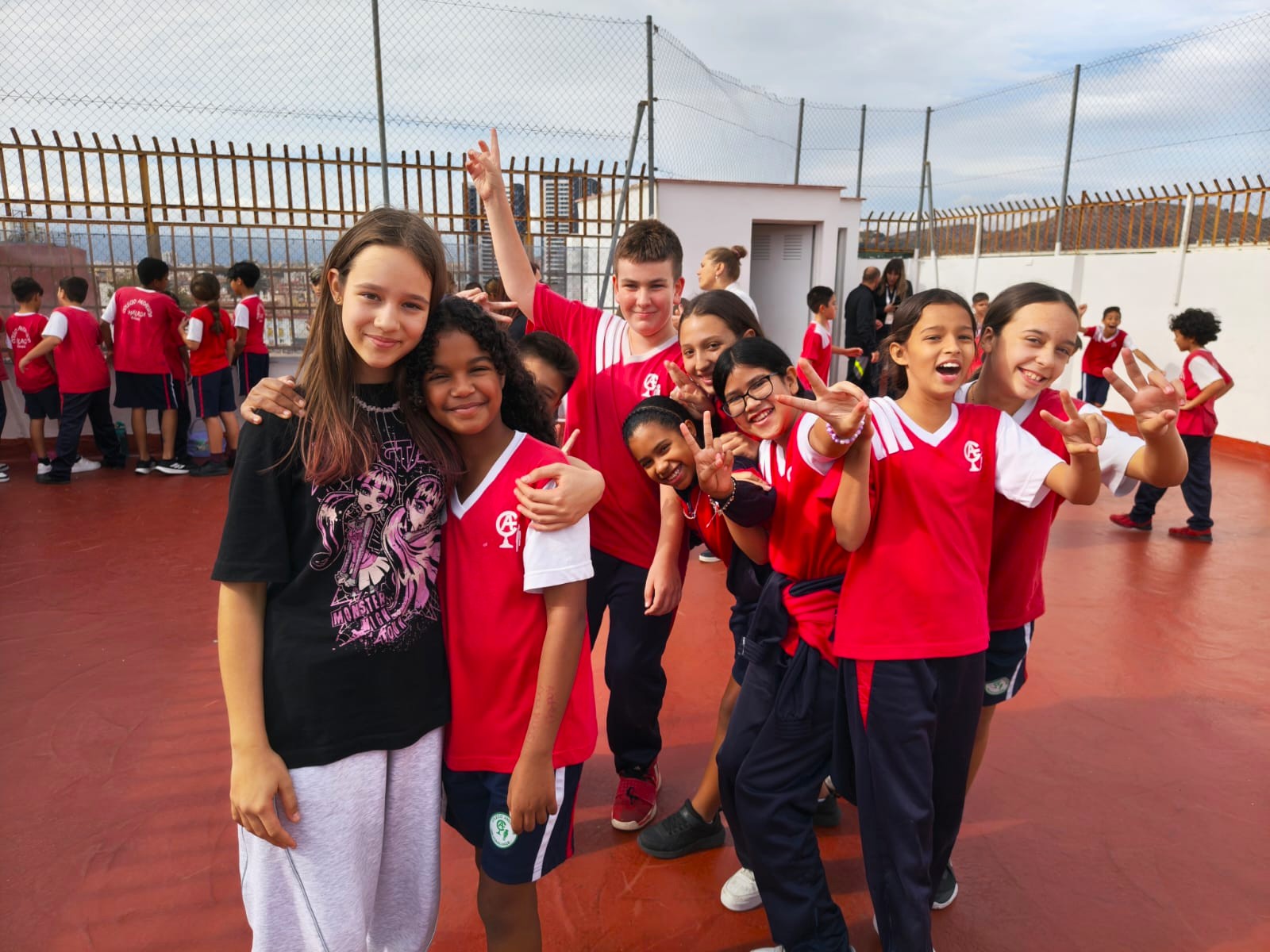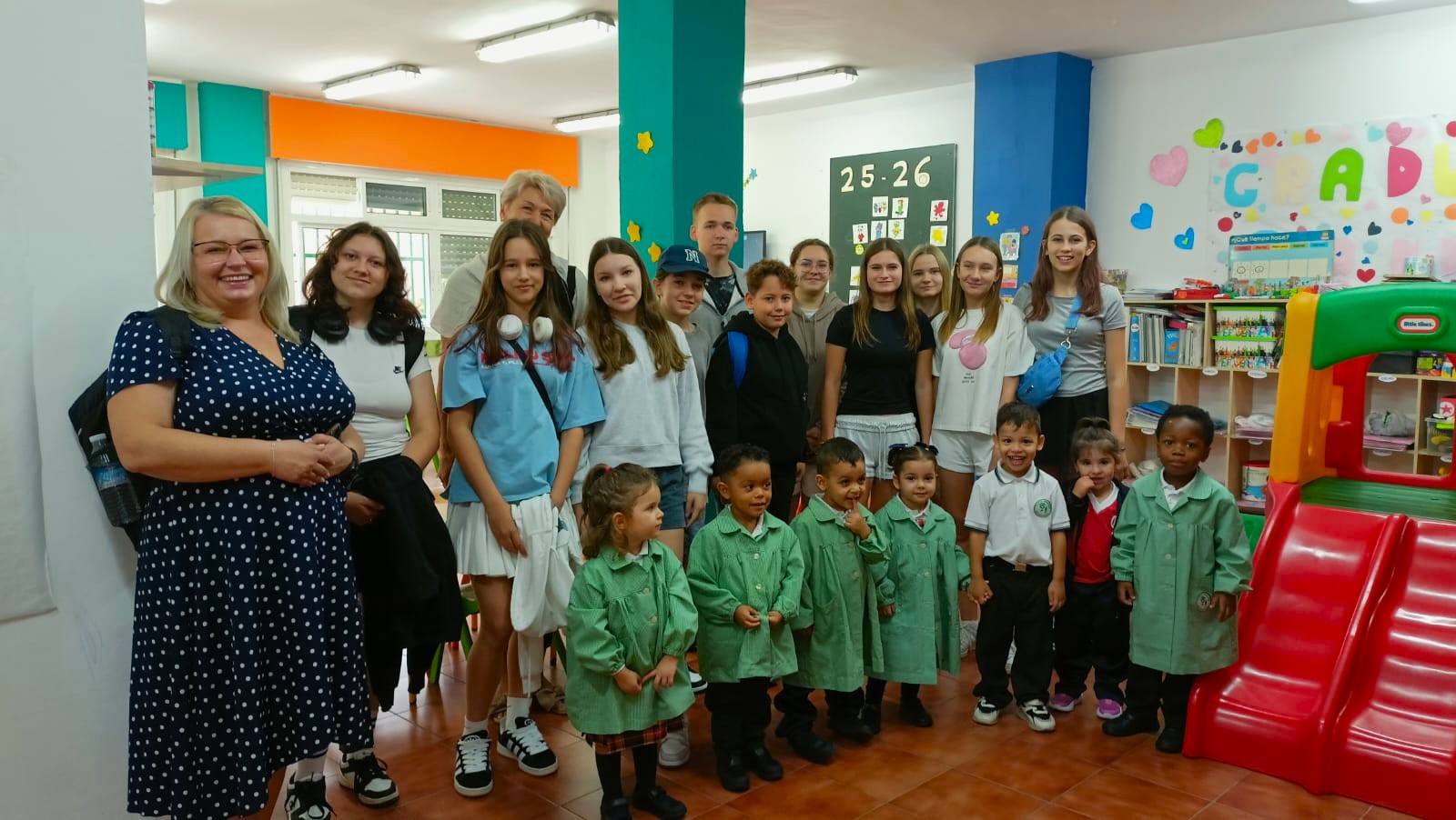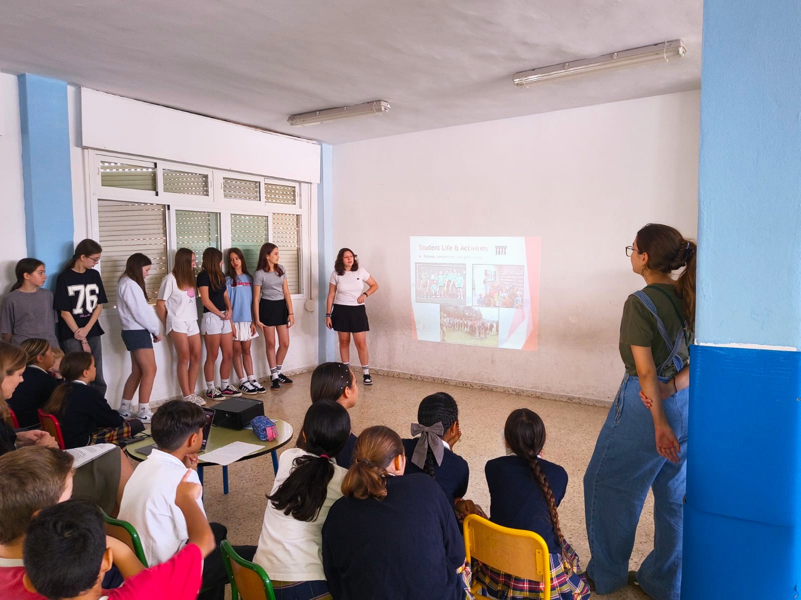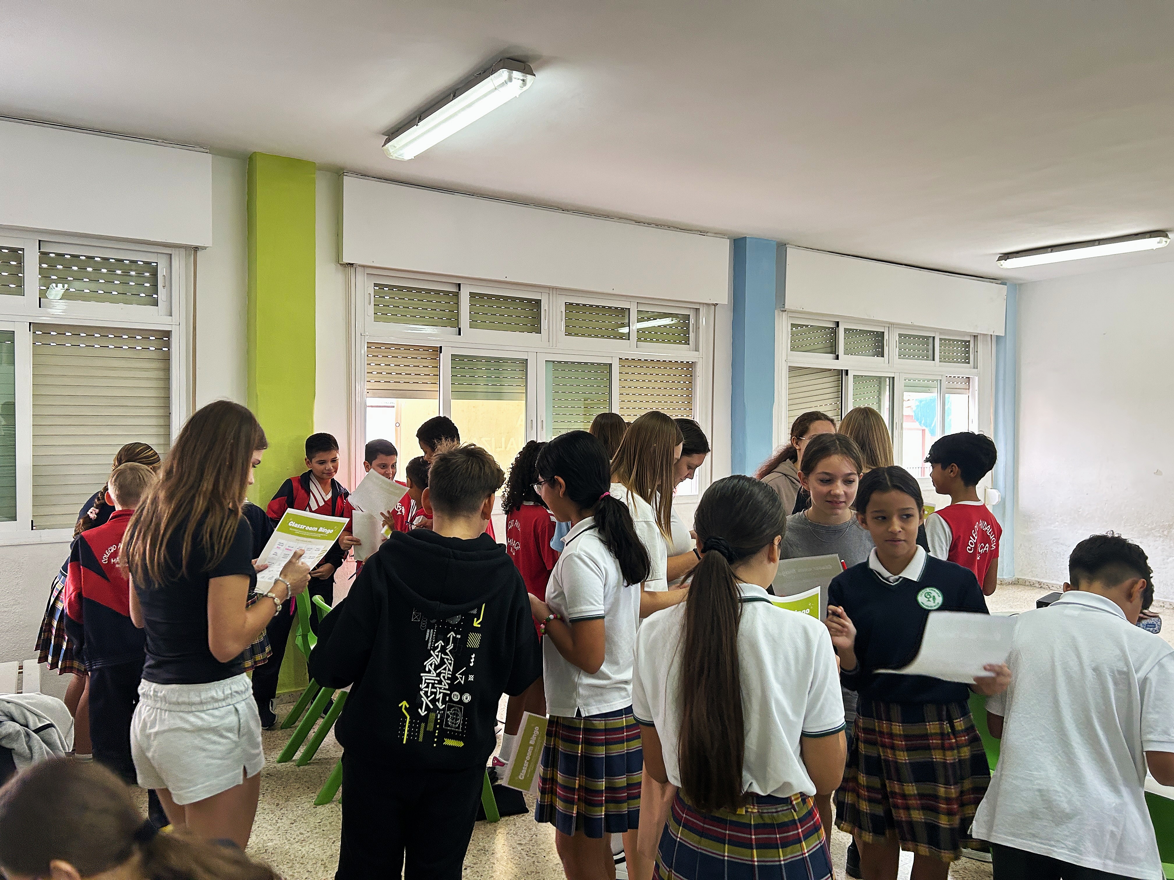 W kolejnych dniach uczniowie dotarli do anglojęzycznej szkoły Colegio Andalucía, gdzie uczestniczyli w zajęciach prowadzonych przez asystentki z Euromind. Polacy prezentowali nasz kraj, jego symbole narodowe, tradycje, ciekawostki i szkołę, zaś Hiszpanie opowiadali o swoich doświadczeniach. Następnie wszyscy zaangażowali się w integracyjną grę Bingo, a zwycięzcy otrzymali drobne upominki. Podczas przerwy rozegrano niezwykły mecz w dwa ognie na boisku mieszczącym się dachu szkoły. Nieco później młodzież pracowała w międzynarodowych zespołach, rozwiązując zagadki i ilustrując charakterystyczne elementy swoich krajów – postaci, miejsca, potrawy, święta i zwyczaje.
