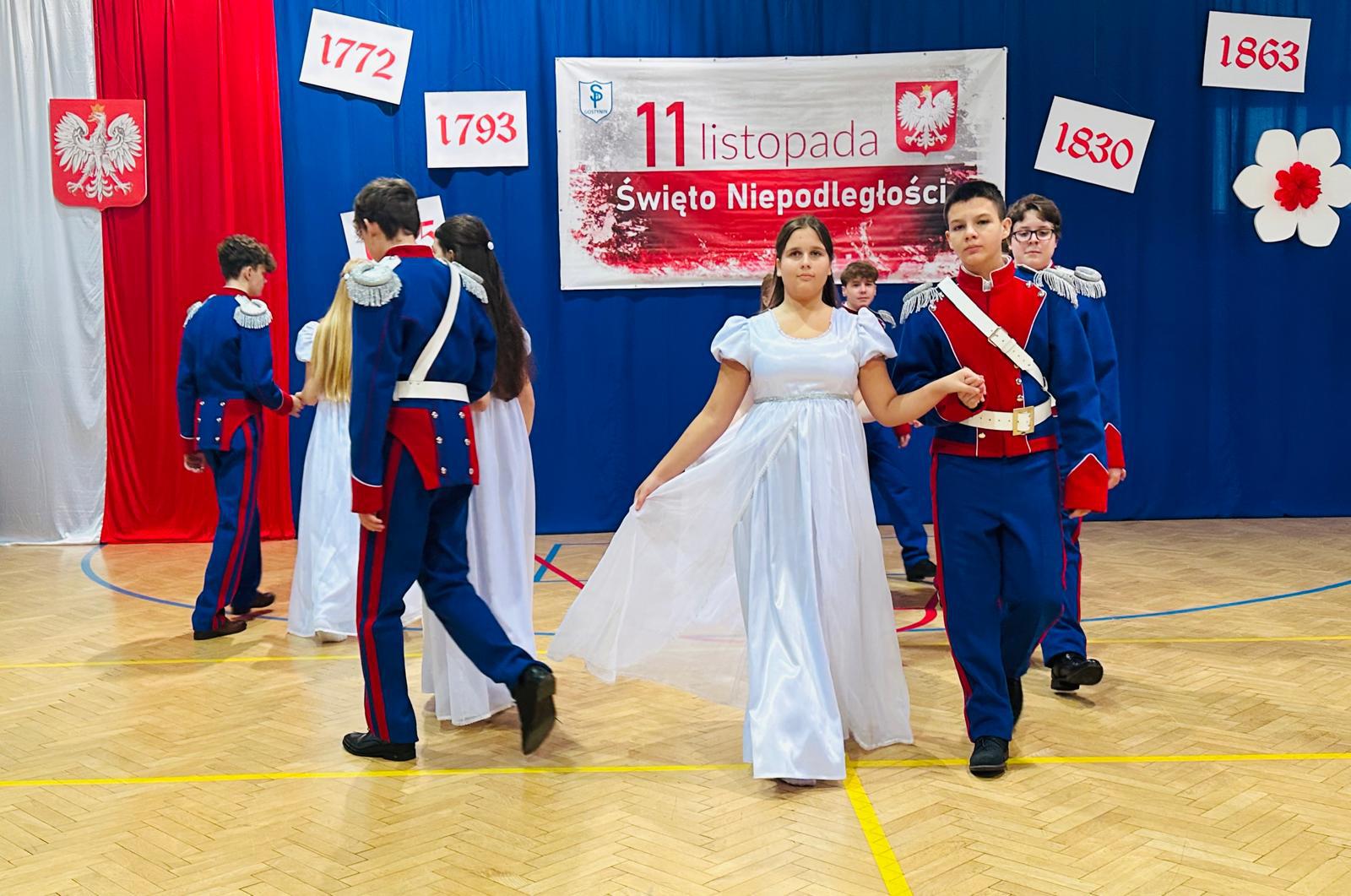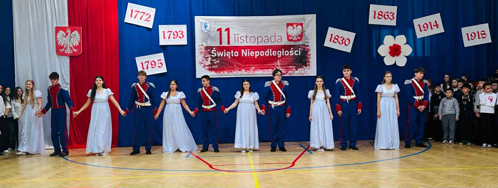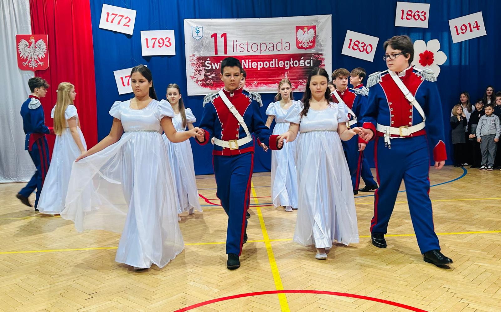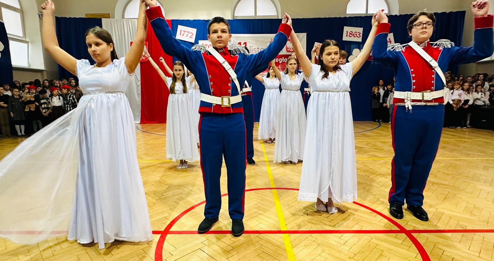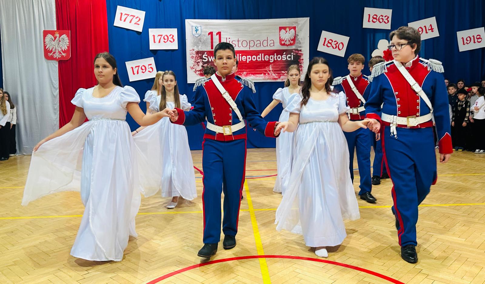 W spektaklu słowno – muzycznym uczniowie Jedynki przypomnieli zebranym w sali gimnastycznej, przepełnioną cierpieniem historię narodu polskiego oraz uczcili pamięć tych, dzięki którym żyjemy dziś w wolnym kraju. Wspaniała lekcja patriotyzmu ukazała heroiczną i nierówną walkę naszych przodków o wyzwolenie. Kulminacyjnym momentem szkolnej uroczystości był taniec poloneza w wykonaniu uczniów klasy ósmej. Młodzież ubrana w epokowe stroje, z niezwykłą gracją zaprezentowała narodowy taniec, który od wieków towarzyszy najważniejszym wydarzeniom w dziejach naszego kraju. Widownia nagrodziła występ długimi brawami, doceniając zarówno kunszt tancerzy, jak i piękno polskiej tradycji.