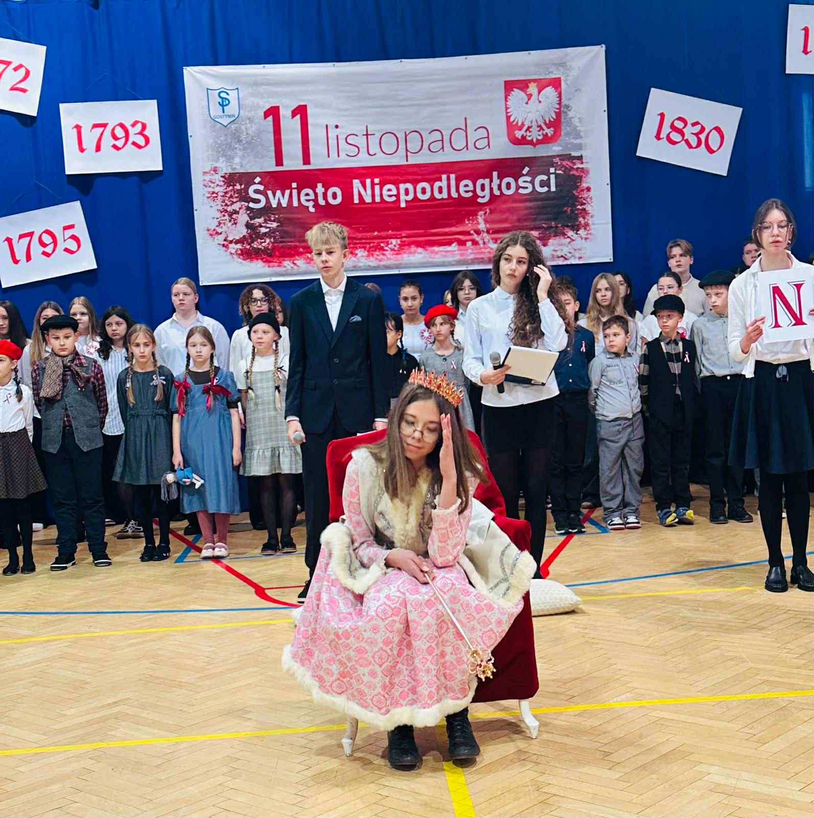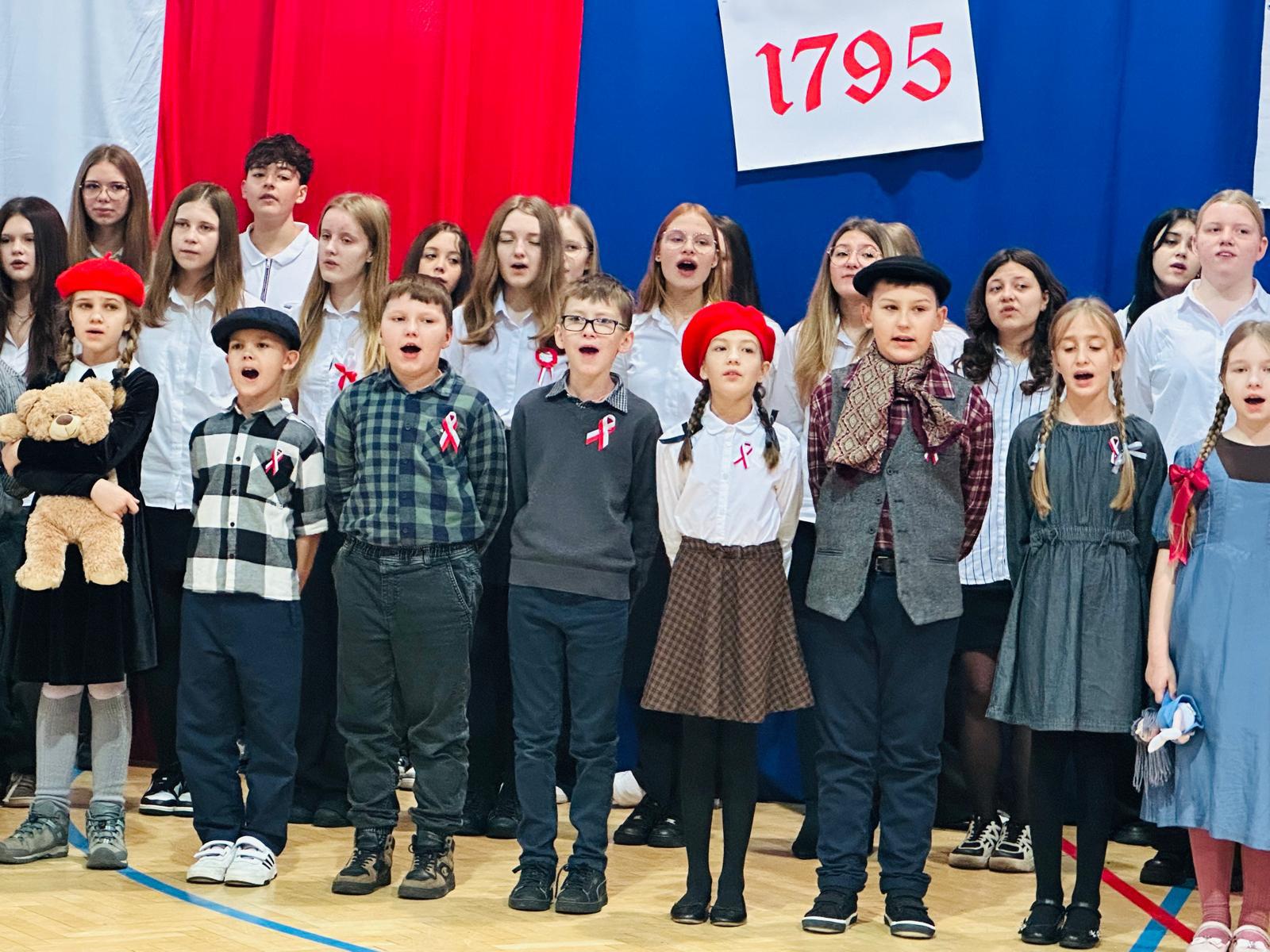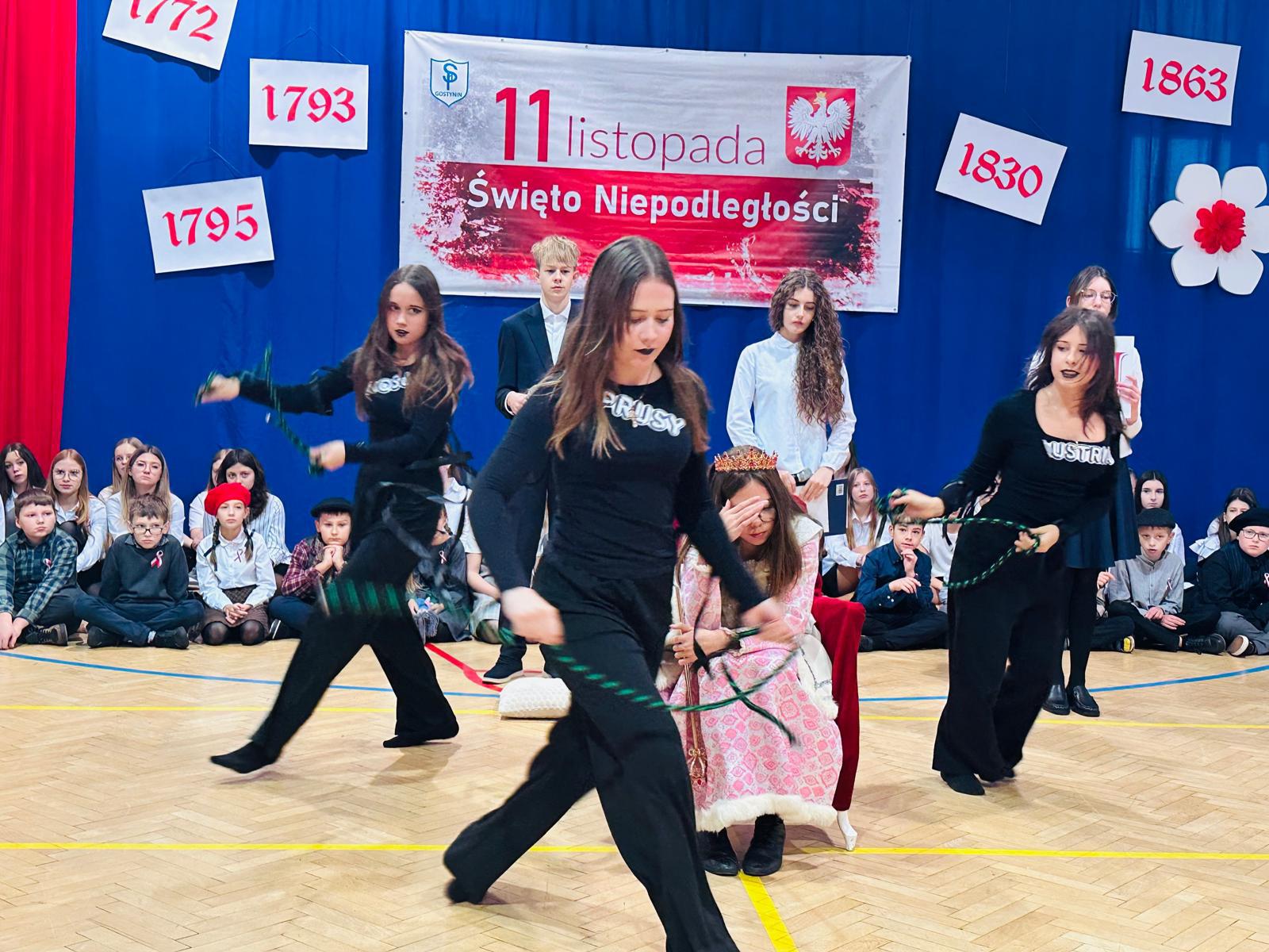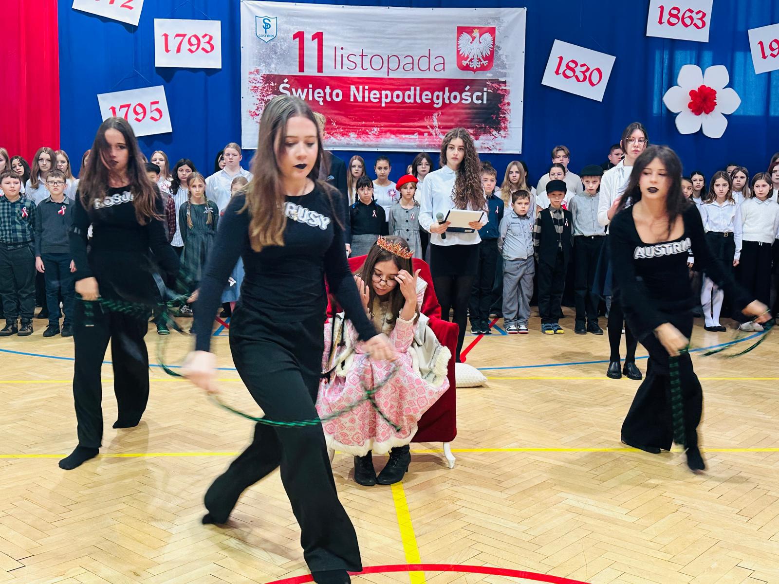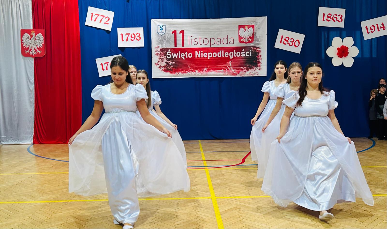 W spektaklu słowno – muzycznym uczniowie Jedynki przypomnieli zebranym w sali gimnastycznej, przepełnioną cierpieniem historię narodu polskiego oraz uczcili pamięć tych, dzięki którym żyjemy dziś w wolnym kraju. Wspaniała lekcja patriotyzmu ukazała heroiczną i nierówną walkę naszych przodków o wyzwolenie. Kulminacyjnym momentem szkolnej uroczystości był taniec poloneza w wykonaniu uczniów klasy ósmej. Młodzież ubrana w epokowe stroje, z niezwykłą gracją zaprezentowała narodowy taniec, który od wieków towarzyszy najważniejszym wydarzeniom w dziejach naszego kraju. Widownia nagrodziła występ długimi brawami, doceniając zarówno kunszt tancerzy, jak i piękno polskiej tradycji.