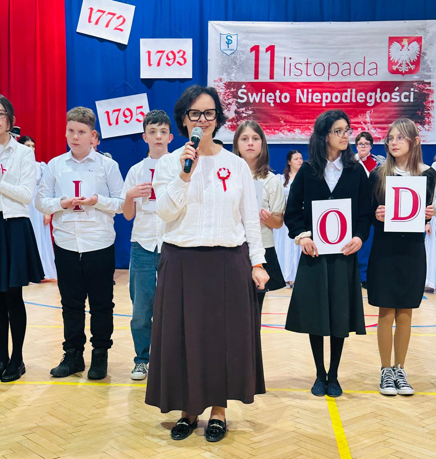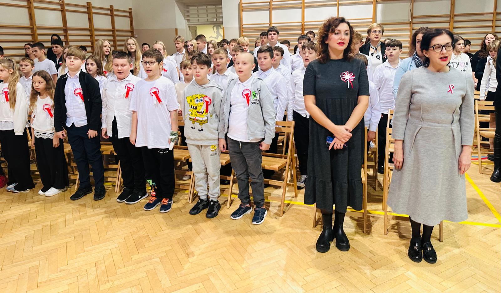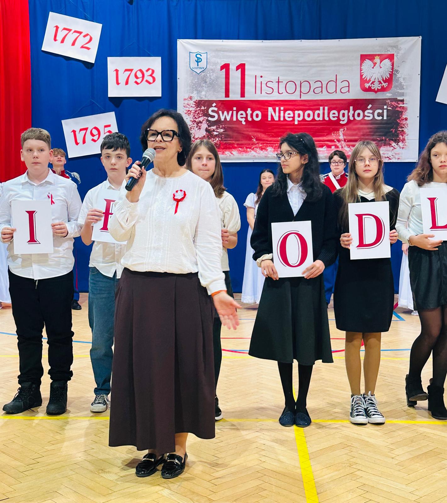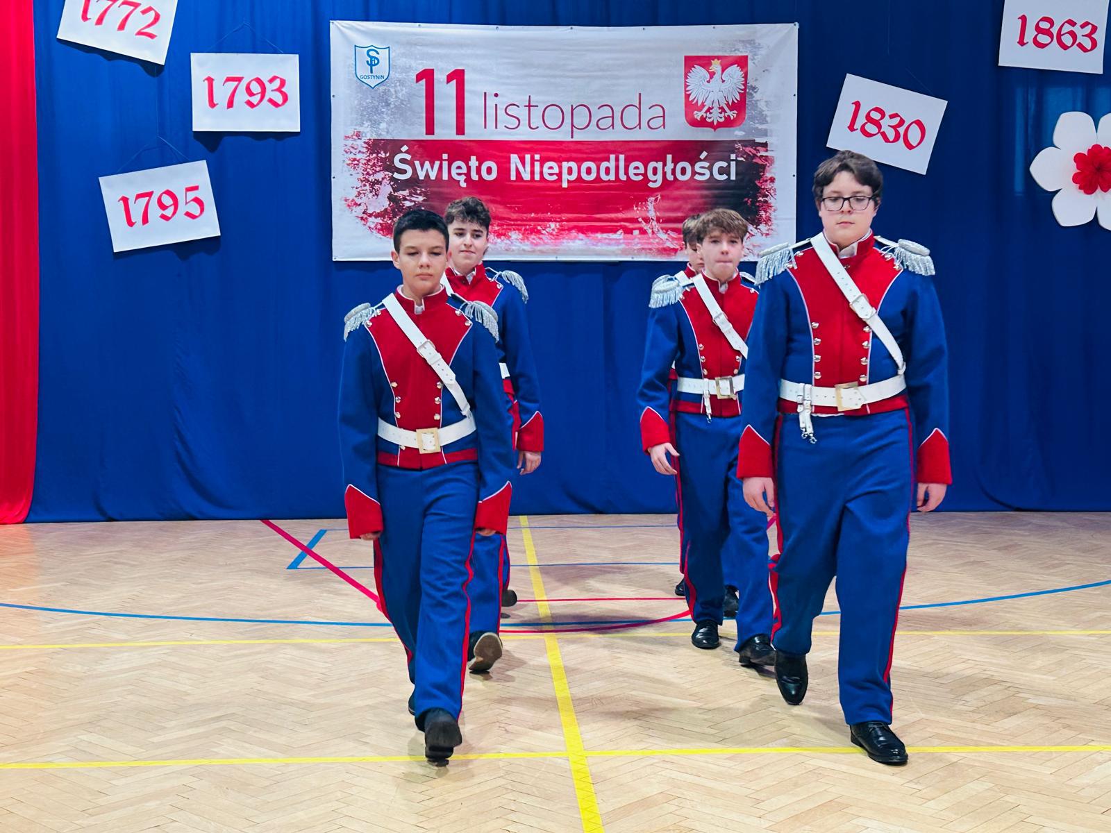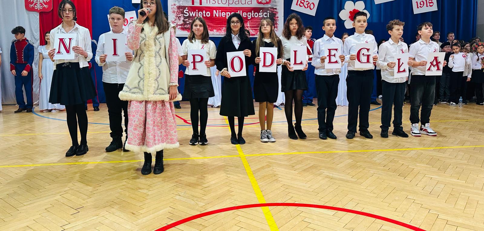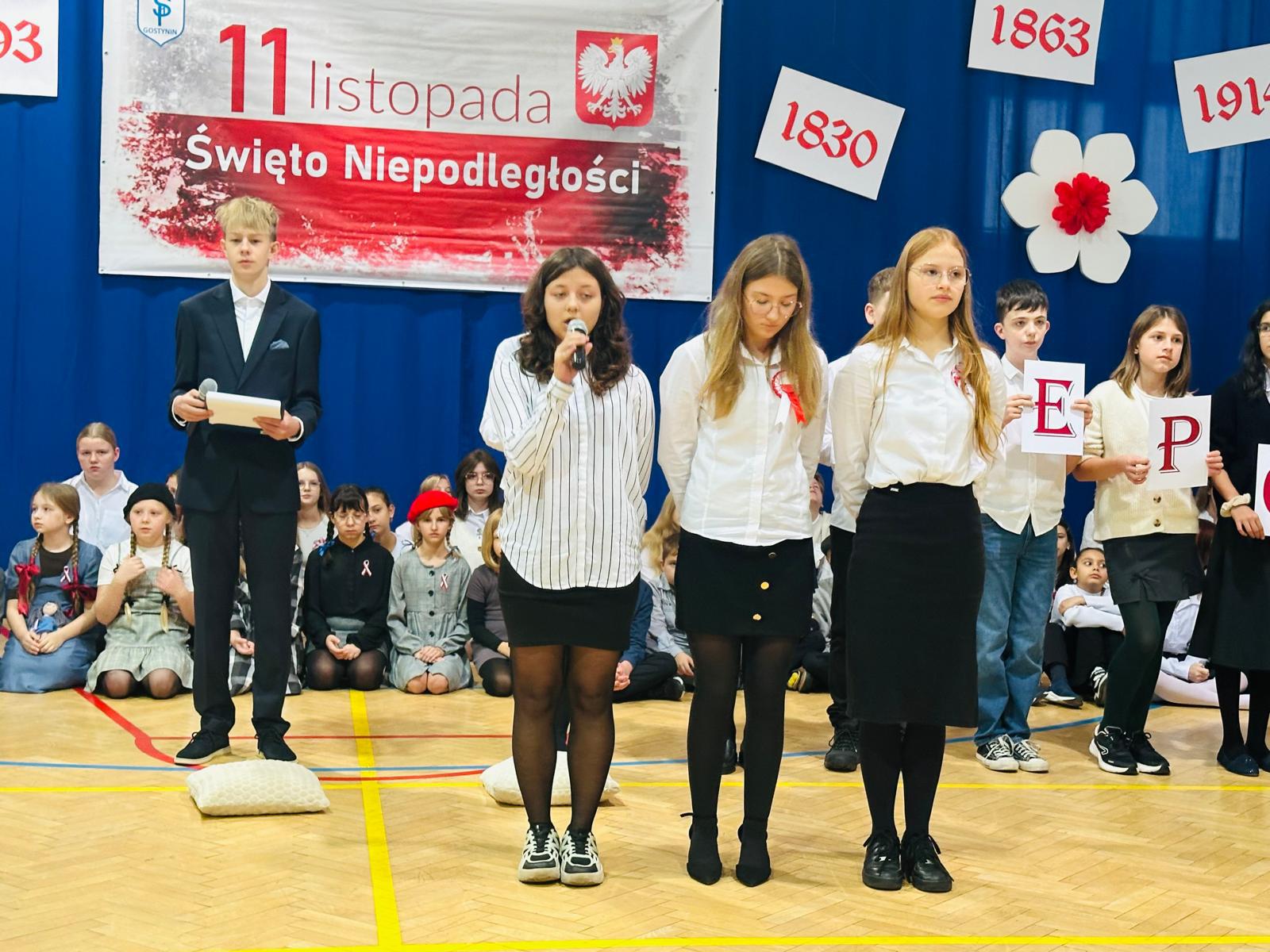 W spektaklu słowno – muzycznym uczniowie Jedynki przypomnieli zebranym w sali gimnastycznej, przepełnioną cierpieniem historię narodu polskiego oraz uczcili pamięć tych, dzięki którym żyjemy dziś w wolnym kraju. Wspaniała lekcja patriotyzmu ukazała heroiczną i nierówną walkę naszych przodków o wyzwolenie. Kulminacyjnym momentem szkolnej uroczystości był taniec poloneza w wykonaniu uczniów klasy ósmej. Młodzież ubrana w epokowe stroje, z niezwykłą gracją zaprezentowała narodowy taniec, który od wieków towarzyszy najważniejszym wydarzeniom w dziejach naszego kraju. Widownia nagrodziła występ długimi brawami, doceniając zarówno kunszt tancerzy, jak i piękno polskiej tradycji.