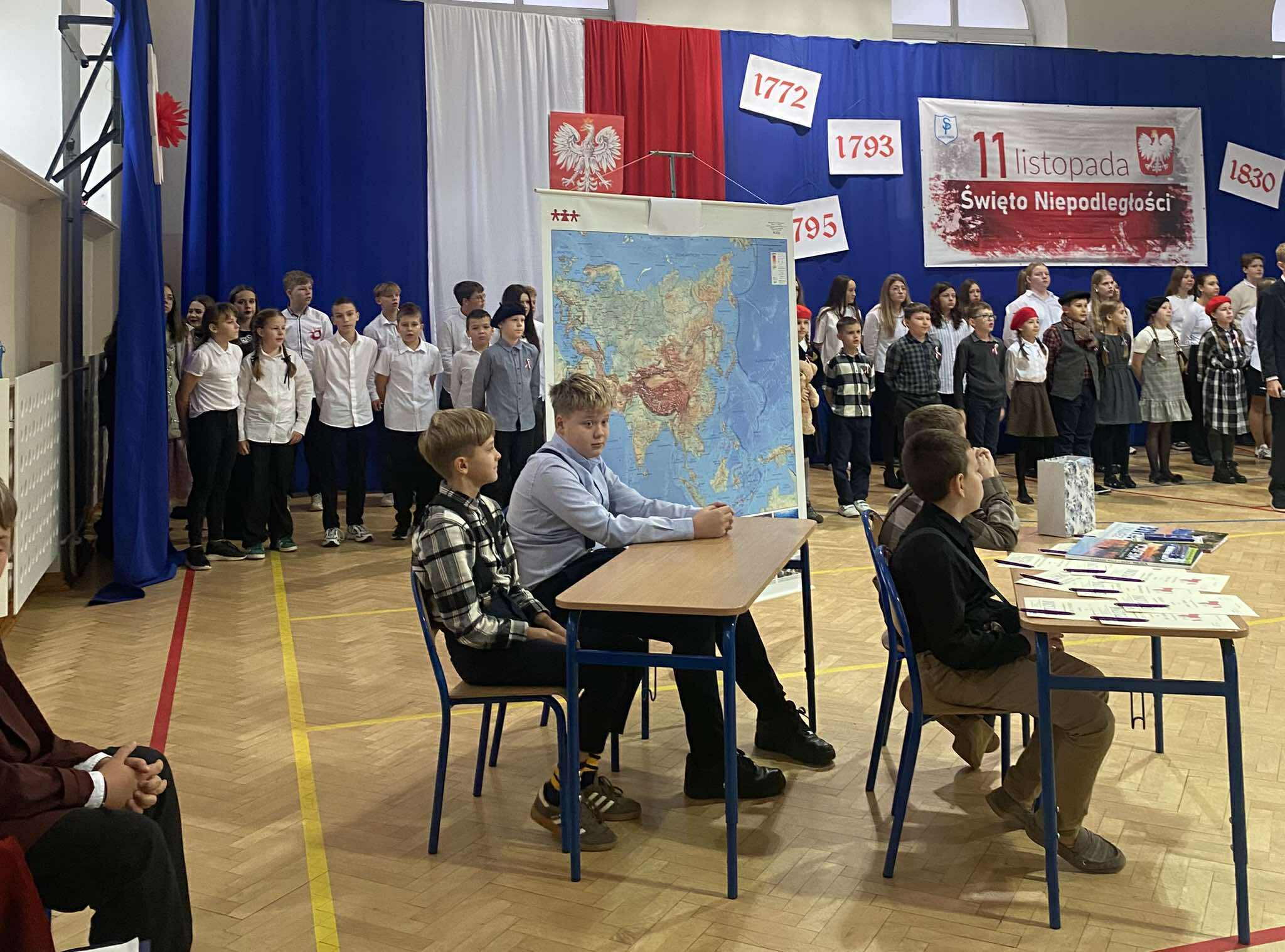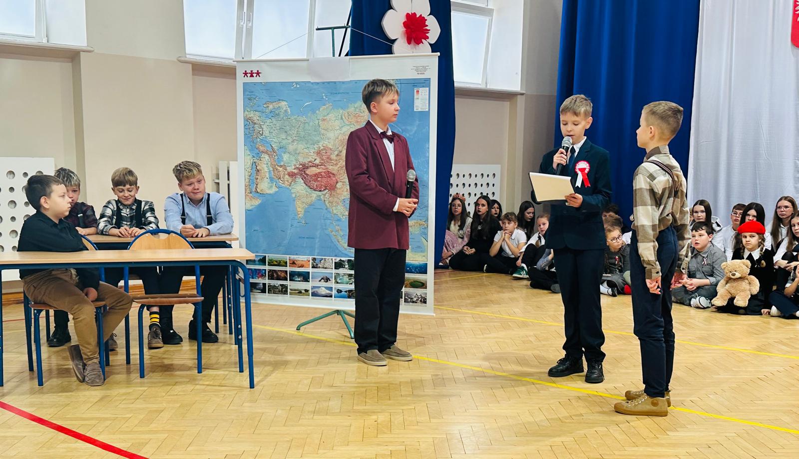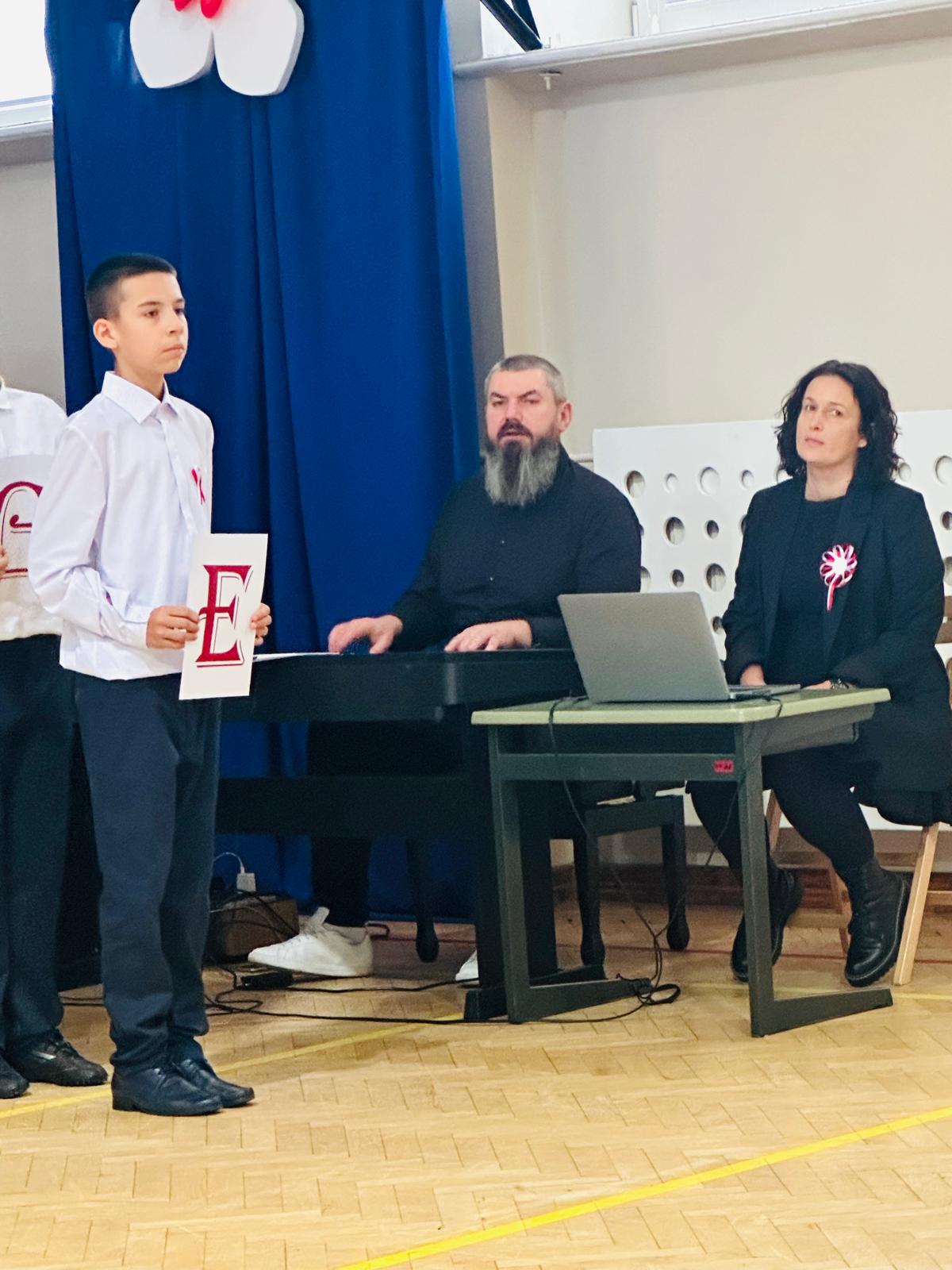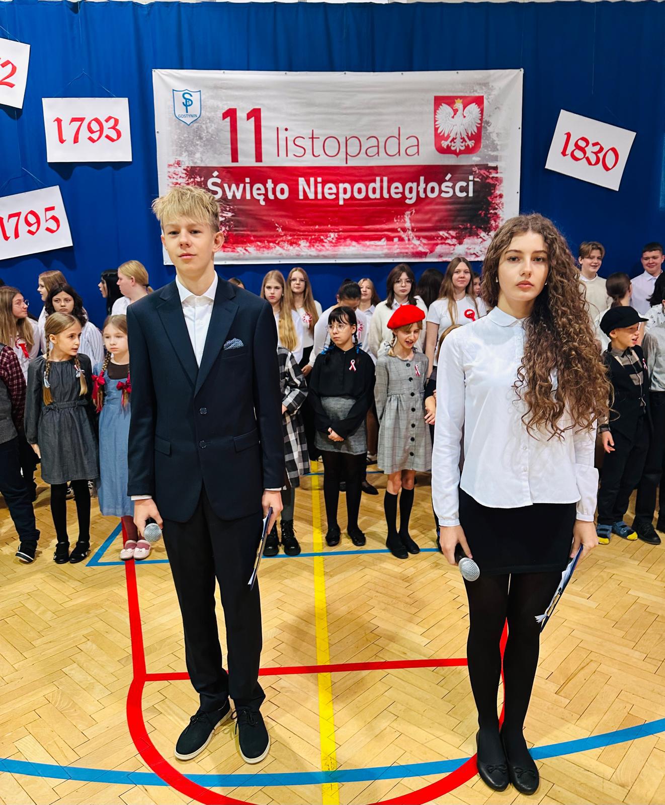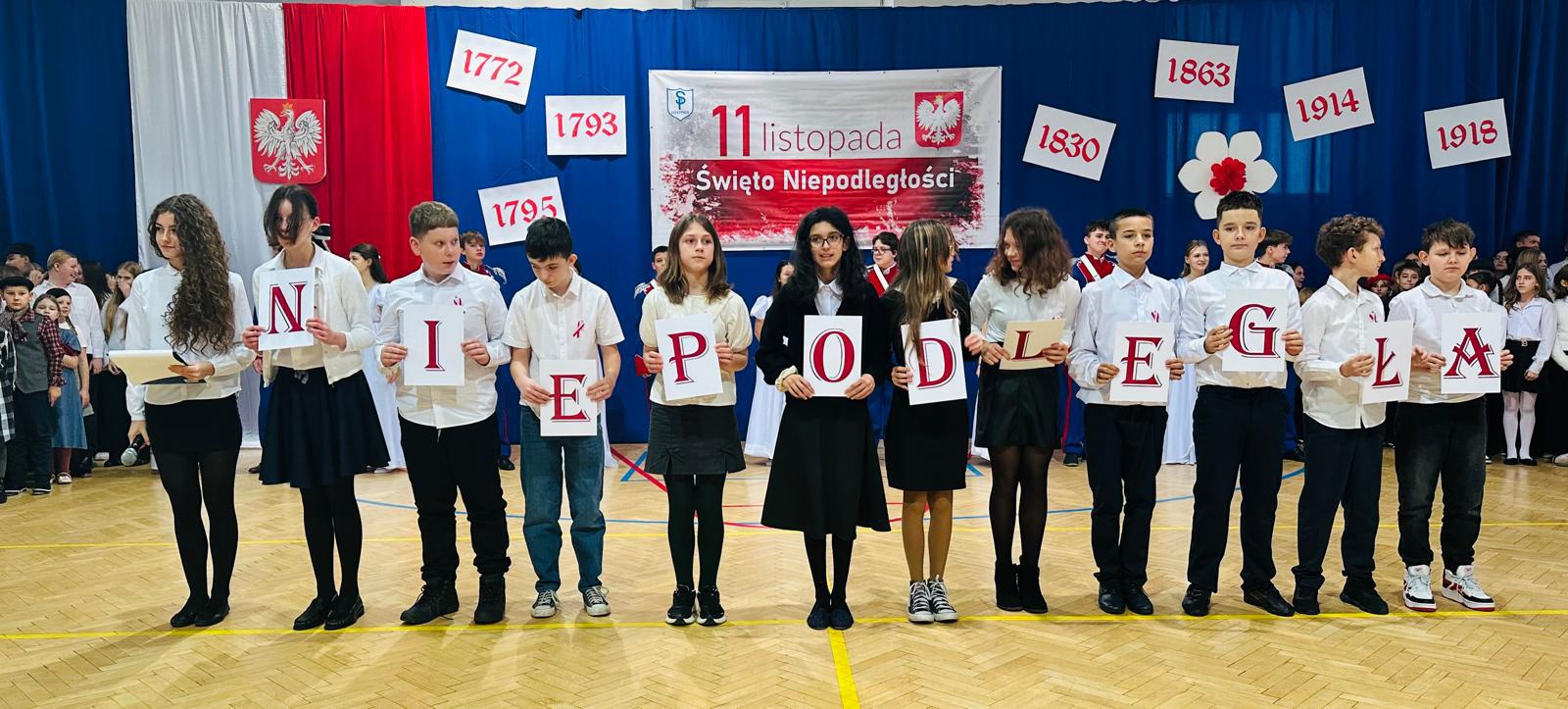 W spektaklu słowno – muzycznym uczniowie Jedynki przypomnieli zebranym w sali gimnastycznej, przepełnioną cierpieniem historię narodu polskiego oraz uczcili pamięć tych, dzięki którym żyjemy dziś w wolnym kraju. Wspaniała lekcja patriotyzmu ukazała heroiczną i nierówną walkę naszych przodków o wyzwolenie. Kulminacyjnym momentem szkolnej uroczystości był taniec poloneza w wykonaniu uczniów klasy ósmej. Młodzież ubrana w epokowe stroje, z niezwykłą gracją zaprezentowała narodowy taniec, który od wieków towarzyszy najważniejszym wydarzeniom w dziejach naszego kraju. Widownia nagrodziła występ długimi brawami, doceniając zarówno kunszt tancerzy, jak i piękno polskiej tradycji.