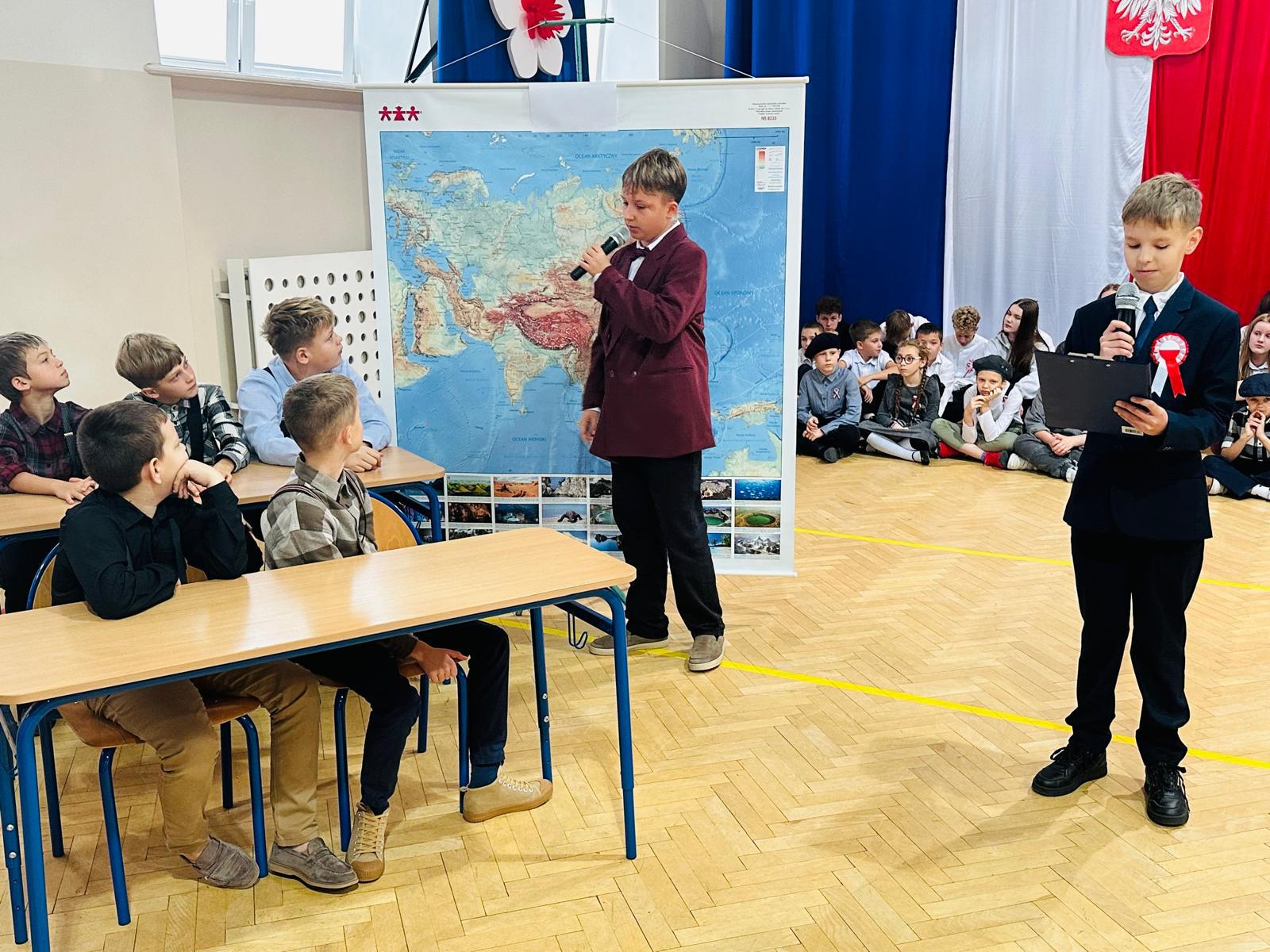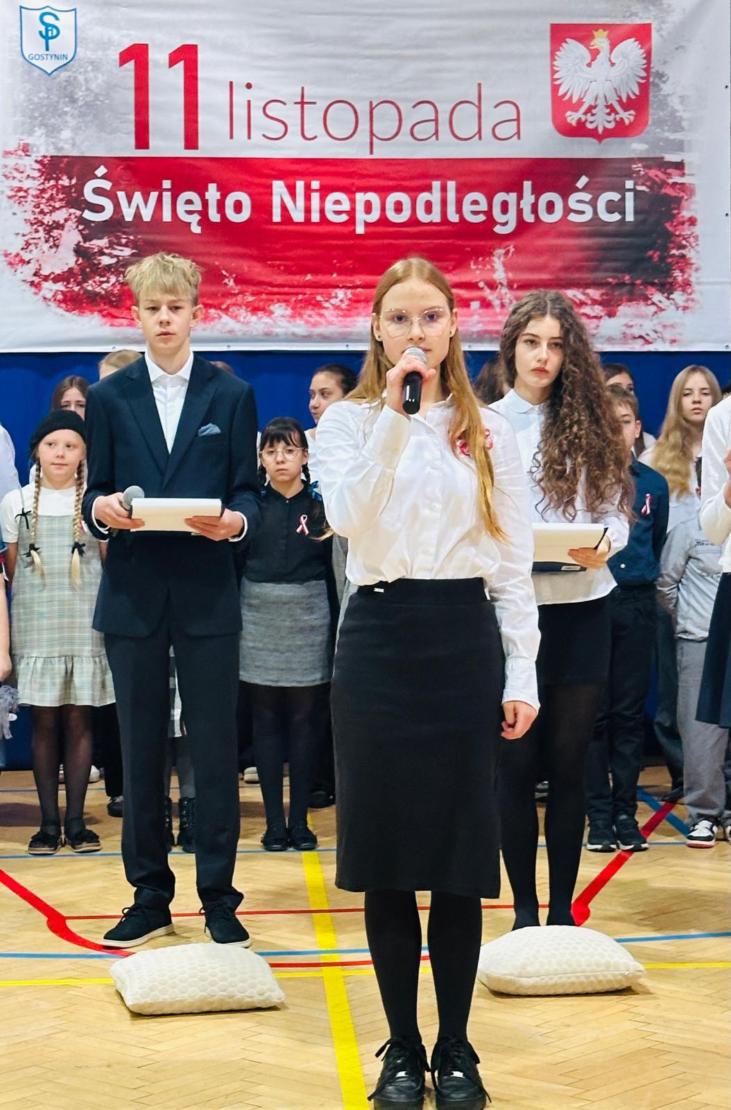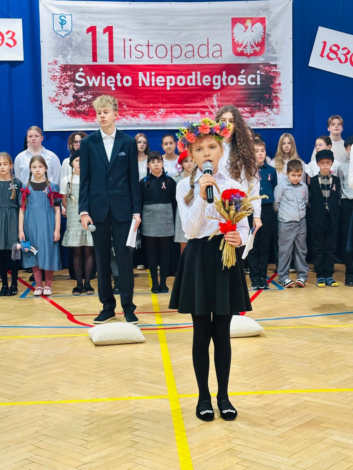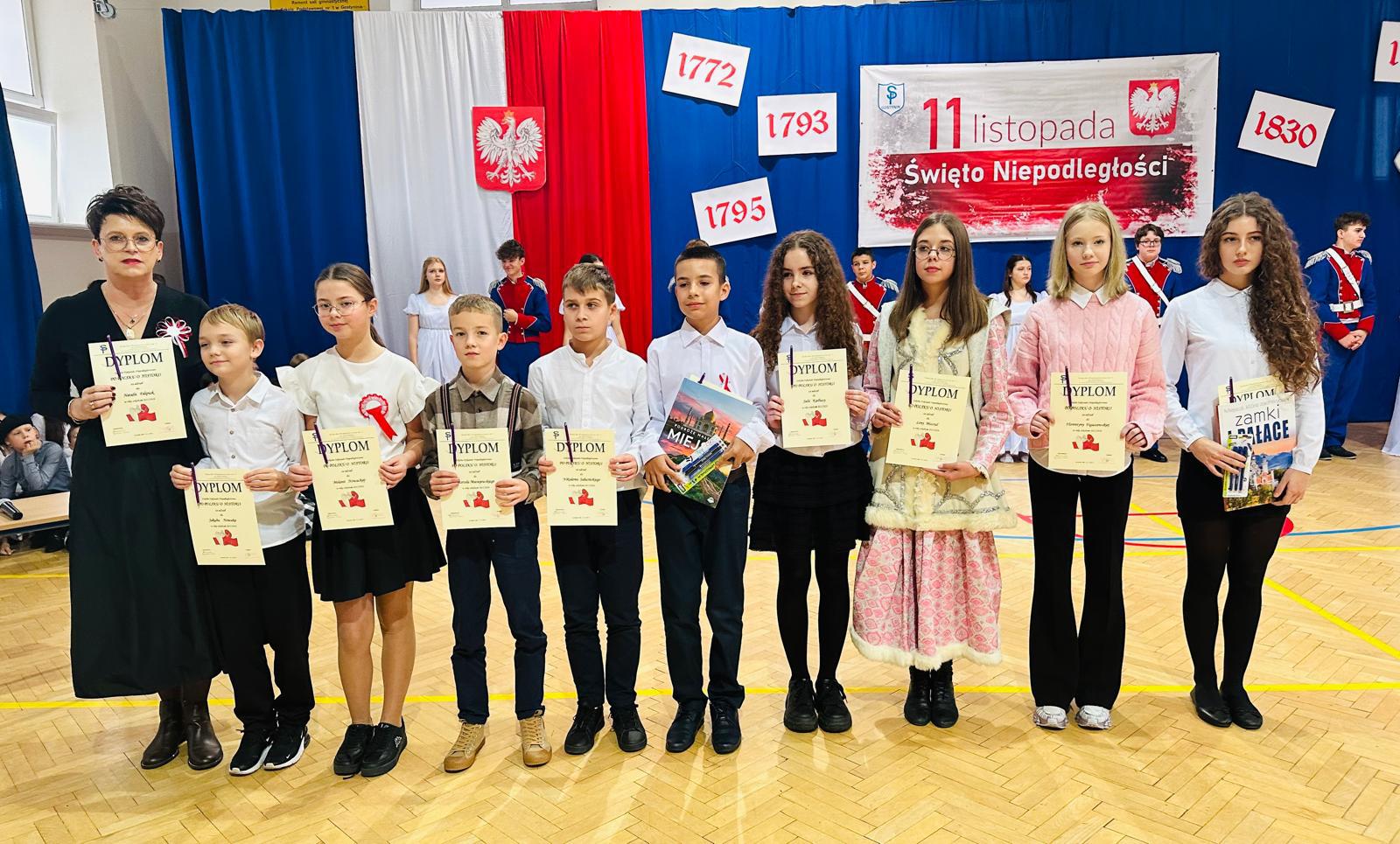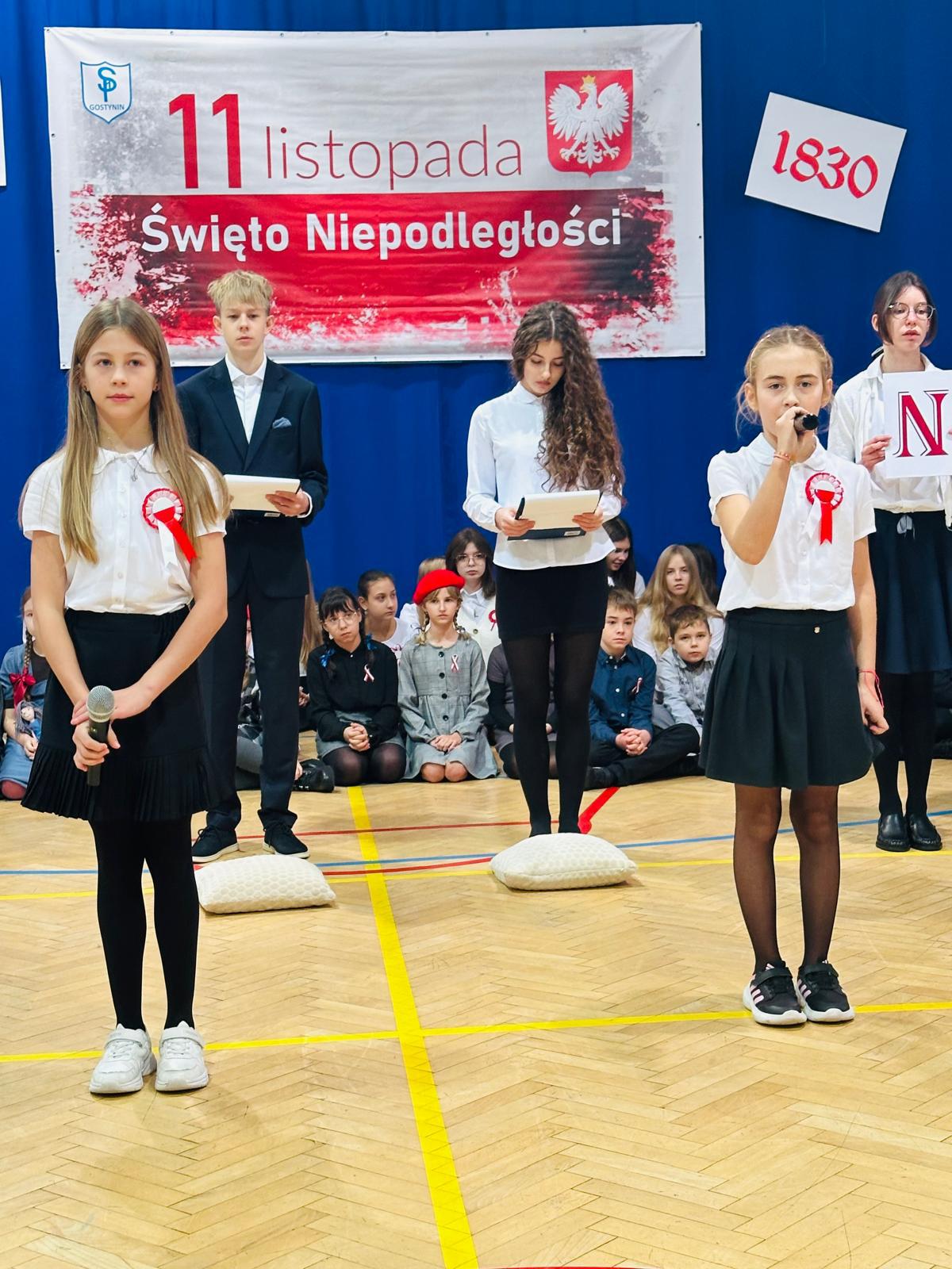 W spektaklu słowno – muzycznym uczniowie Jedynki przypomnieli zebranym w sali gimnastycznej, przepełnioną cierpieniem historię narodu polskiego oraz uczcili pamięć tych, dzięki którym żyjemy dziś w wolnym kraju. Wspaniała lekcja patriotyzmu ukazała heroiczną i nierówną walkę naszych przodków o wyzwolenie. Kulminacyjnym momentem szkolnej uroczystości był taniec poloneza w wykonaniu uczniów klasy ósmej. Młodzież ubrana w epokowe stroje, z niezwykłą gracją zaprezentowała narodowy taniec, który od wieków towarzyszy najważniejszym wydarzeniom w dziejach naszego kraju. Widownia nagrodziła występ długimi brawami, doceniając zarówno kunszt tancerzy, jak i piękno polskiej tradycji.