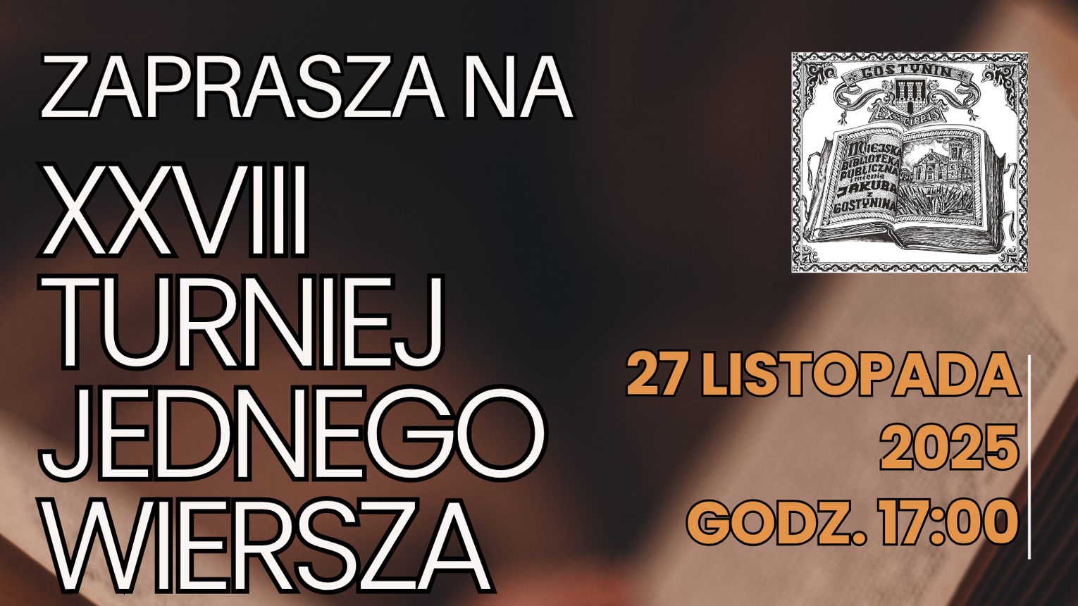 Miejska Biblioteka Publiczna im. Jakuba z Gostynina serdecznie zaprasza na XXVIII Turniej Jednego Wiersza, który odbędzie się w czwartek, 27 listopada 2025 roku o godzinie 17:00 w sali Szkoły Muzycznej im. Romualda Twardowskiego w Gostyninie. To coroczne święto poezji przyciąga zarówno uznanych twórców, jak i amatorów pragnących pokazać swoje literackie umiejętności. Podczas wydarzenia uczestnicy będą mieli okazję zaprezentować swoje wiersze, rywalizując o uznanie jury oraz publiczności.