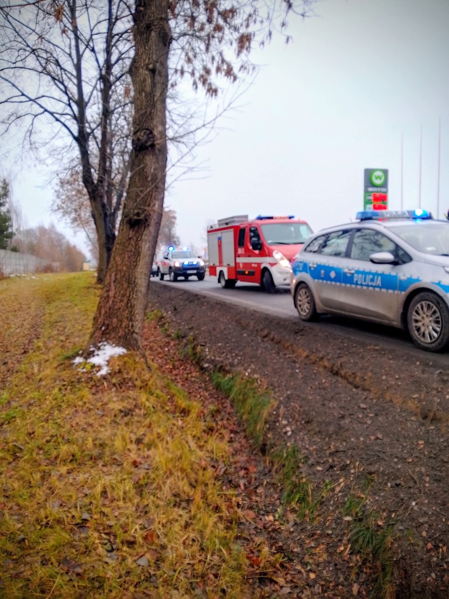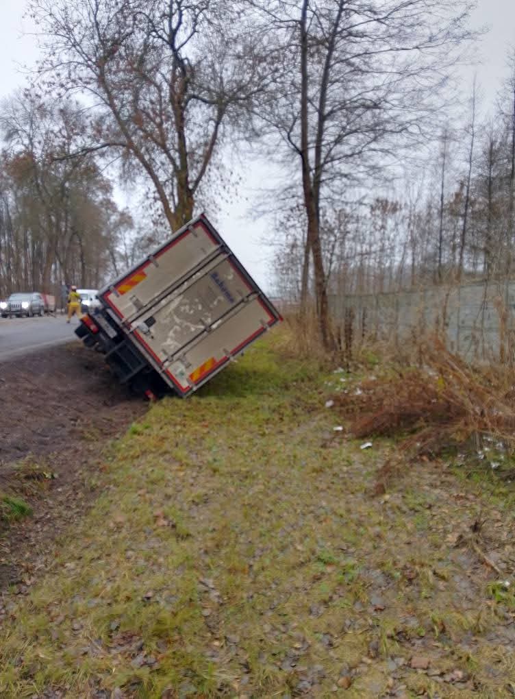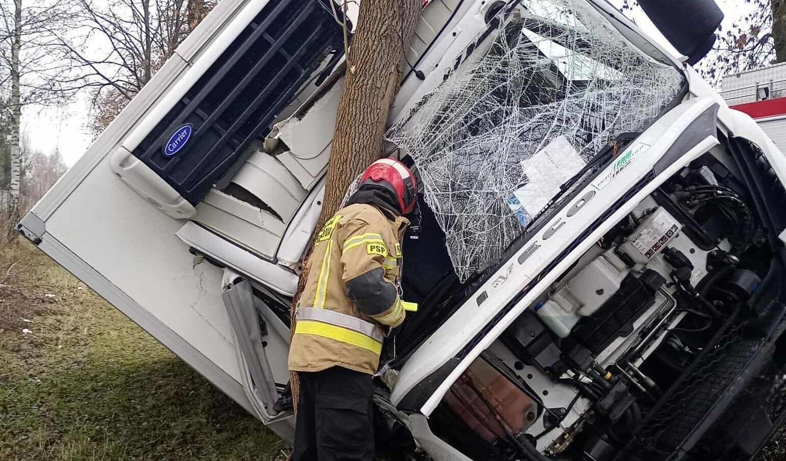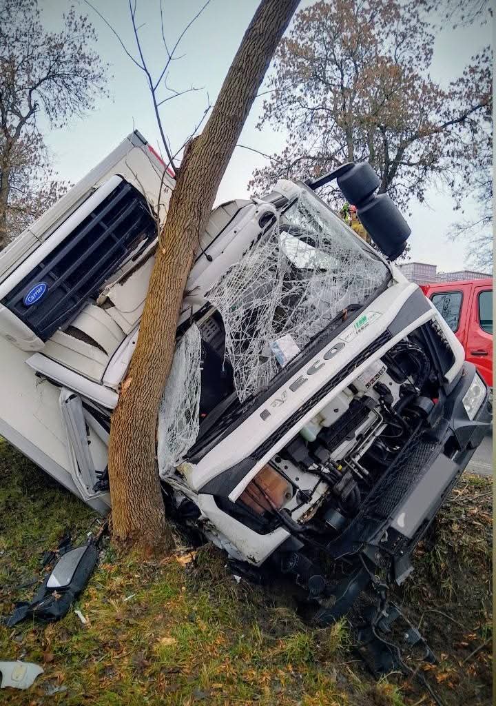 48-letni kierujący ciężarowym Iveco z niewyjaśnionych przyczyn zjechał z drogi i uderzył w drzewo. Na szczęście nikt nie doznał poważnych obrażeń. Kierujący był trzeźwy. Ruch odbywa się bez utrudnień.