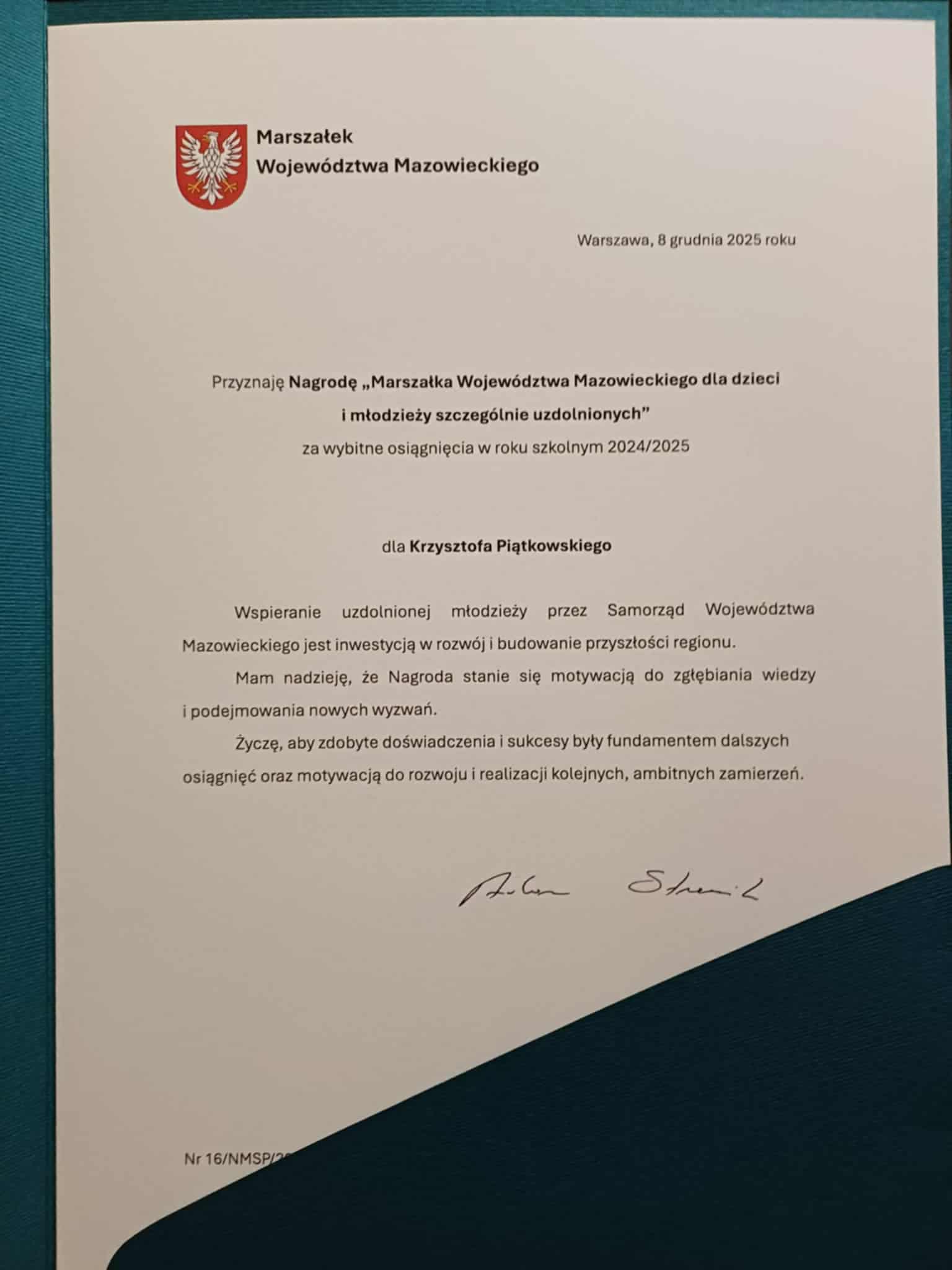 Krzyś Piątkowski został wyróżniony Nagrodą Marszałka Województwa Mazowieckiego dla dzieci i młodzieży szczególnie uzdolnionych za wybitne osiągnięcia w roku szkolnym 2024/2025.