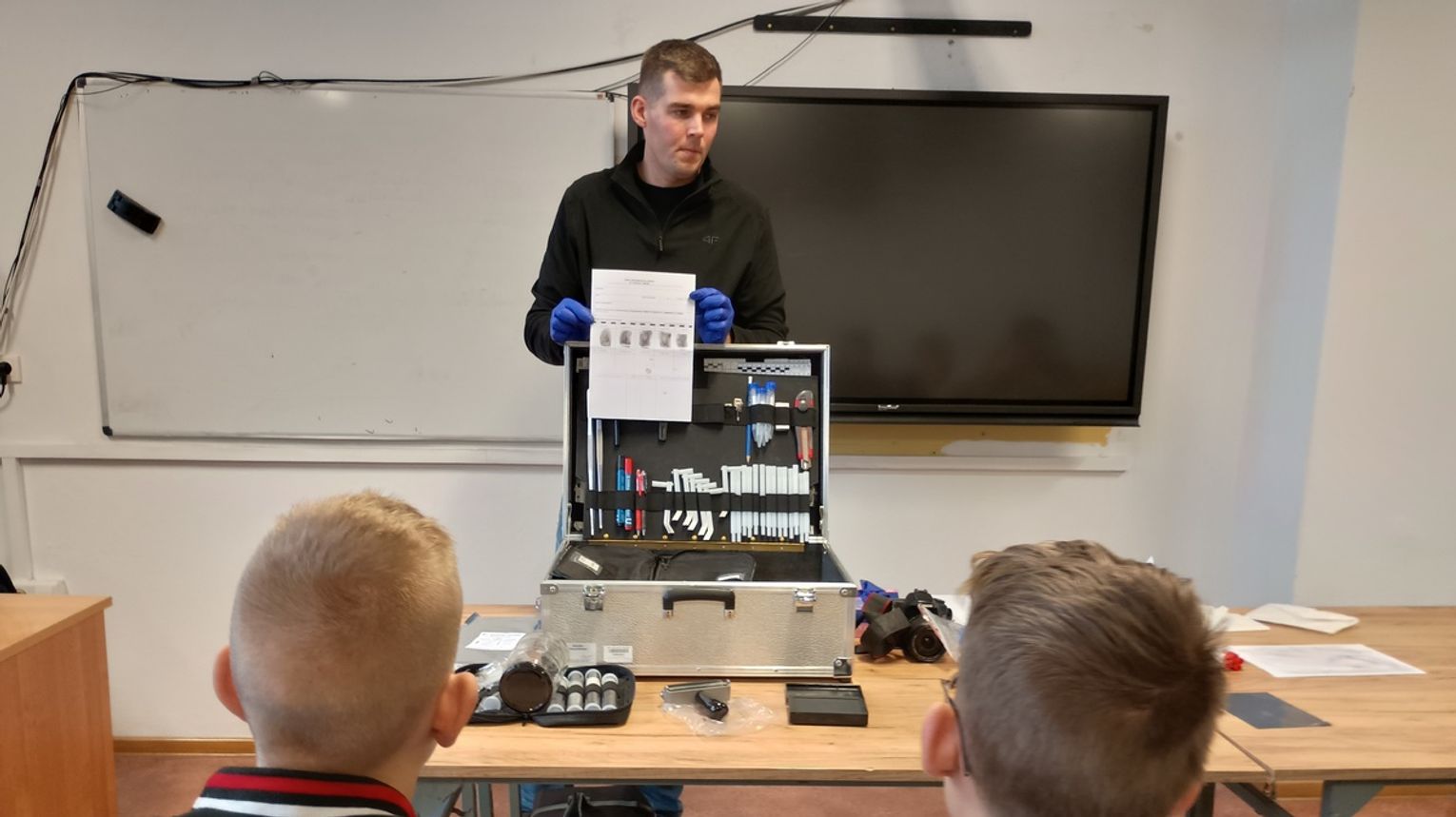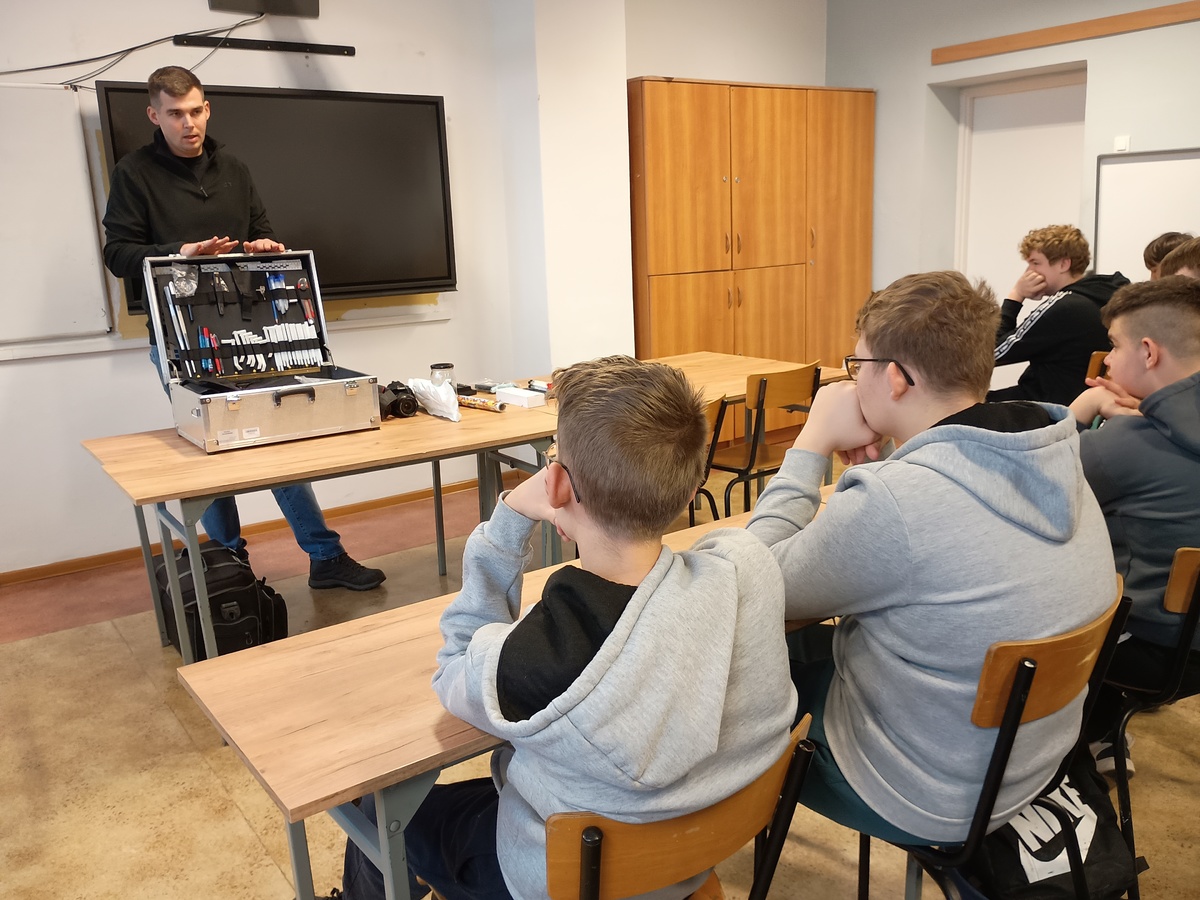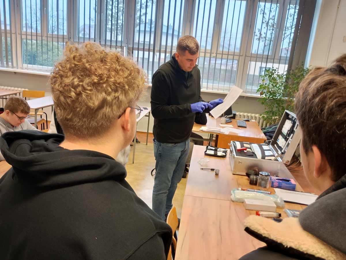Prelekcję poprowadził policjant z gostynińskiej komendy pełniący służbę na stanowisku technika kryminalistyki. Podczas spotkania uczniowie zapoznali się z podstawowymi pojęciami oraz zagadnieniami związanymi z zabezpieczaniem śladów na miejscu zdarzenia, a także rolą technika kryminalistyki w postępowaniu przygotowawczym.