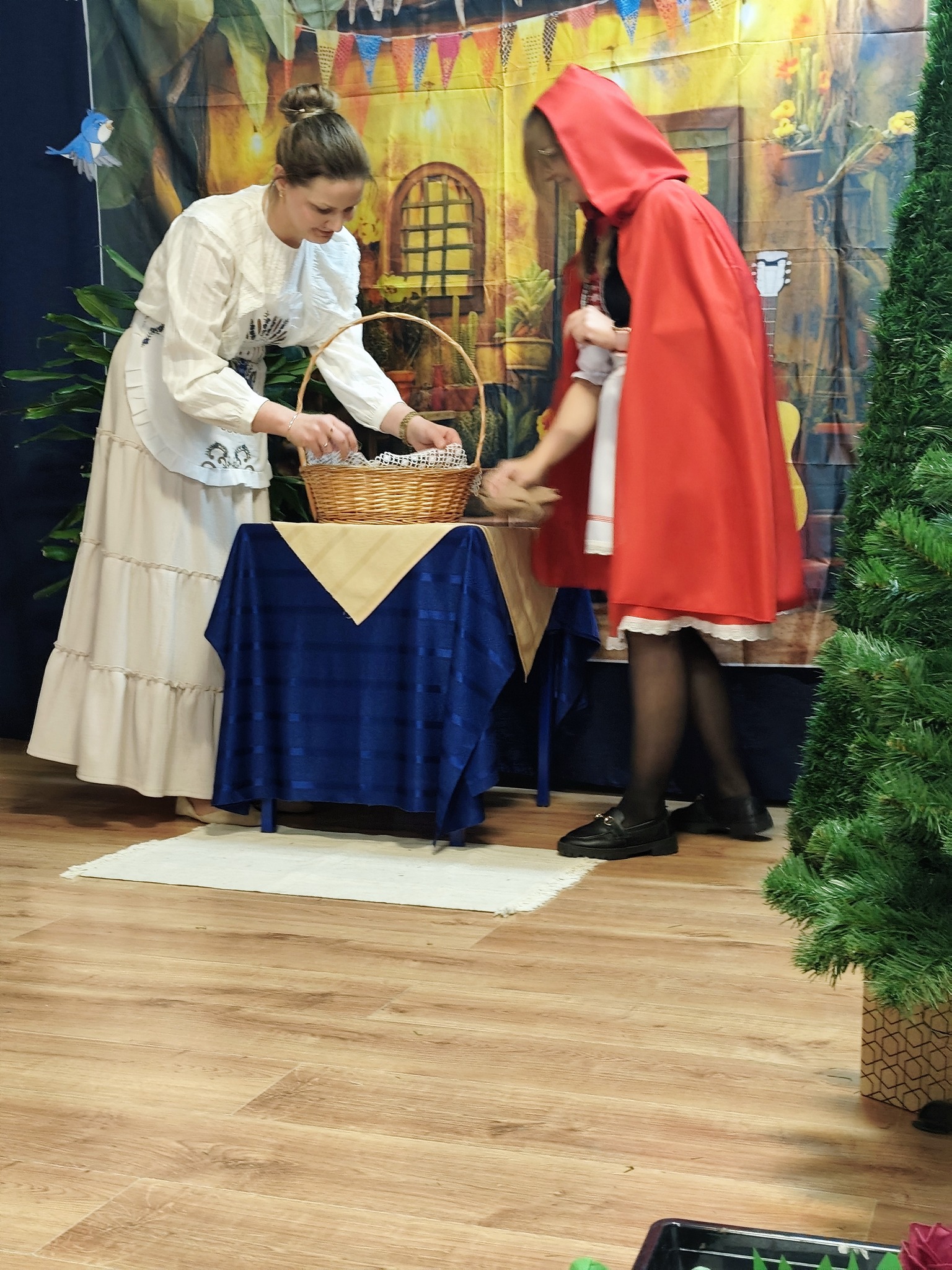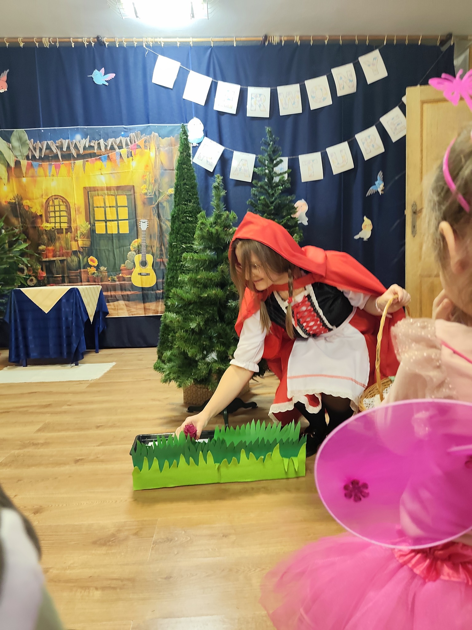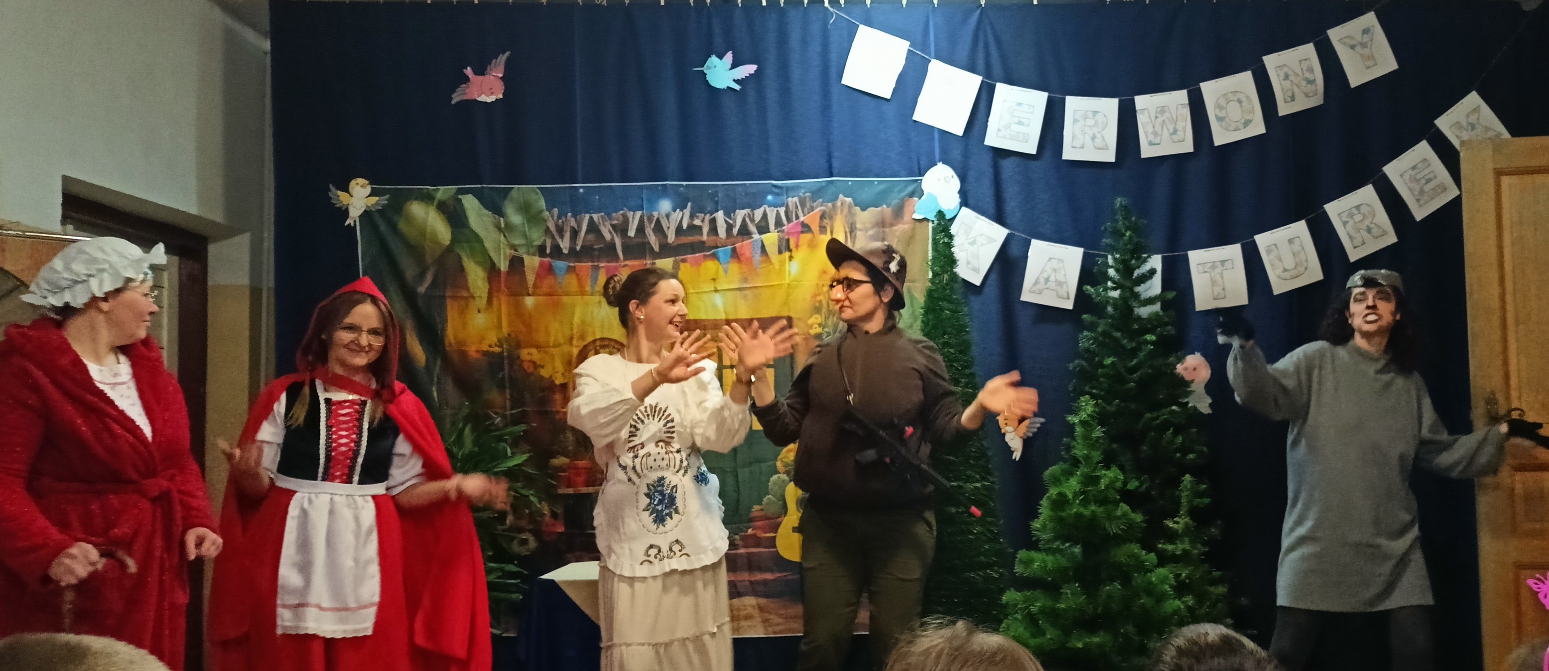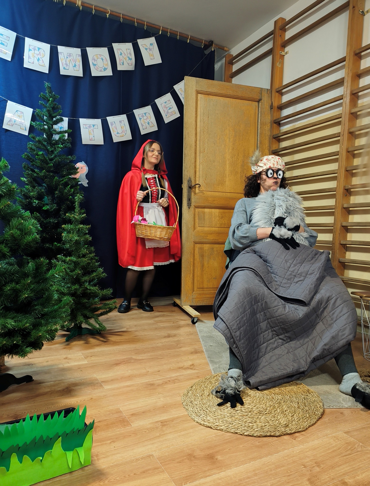 W tym roku mogliśmy podziwiać na naszej scenie znaną baśń „Czerwony Kapturek” w nowej, pełnej humoru odsłonie. Barwne kostiumy, starannie przygotowana scenografia, a przede wszystkim ogromne zaangażowanie nauczycieli i rodziców sprawiły, że widownia od pierwszych minut była zachwycona. Nie zabrakło śmiechu i akcji pełnej momentów zaskoczenia. Aktorzy potrafili nawiązać z publicznością żywą interakcję, co oczywiście najbardziej spodobało się najmłodszym.