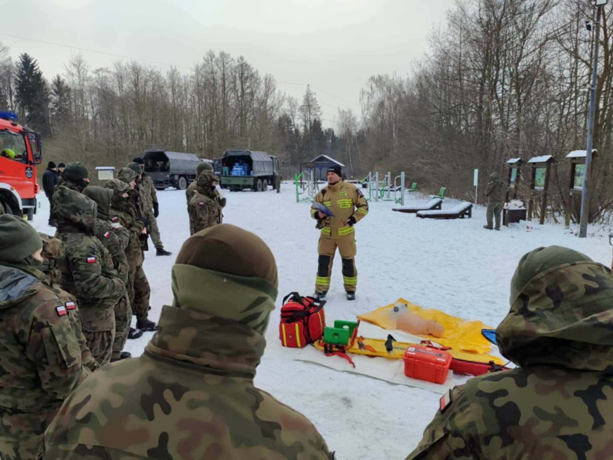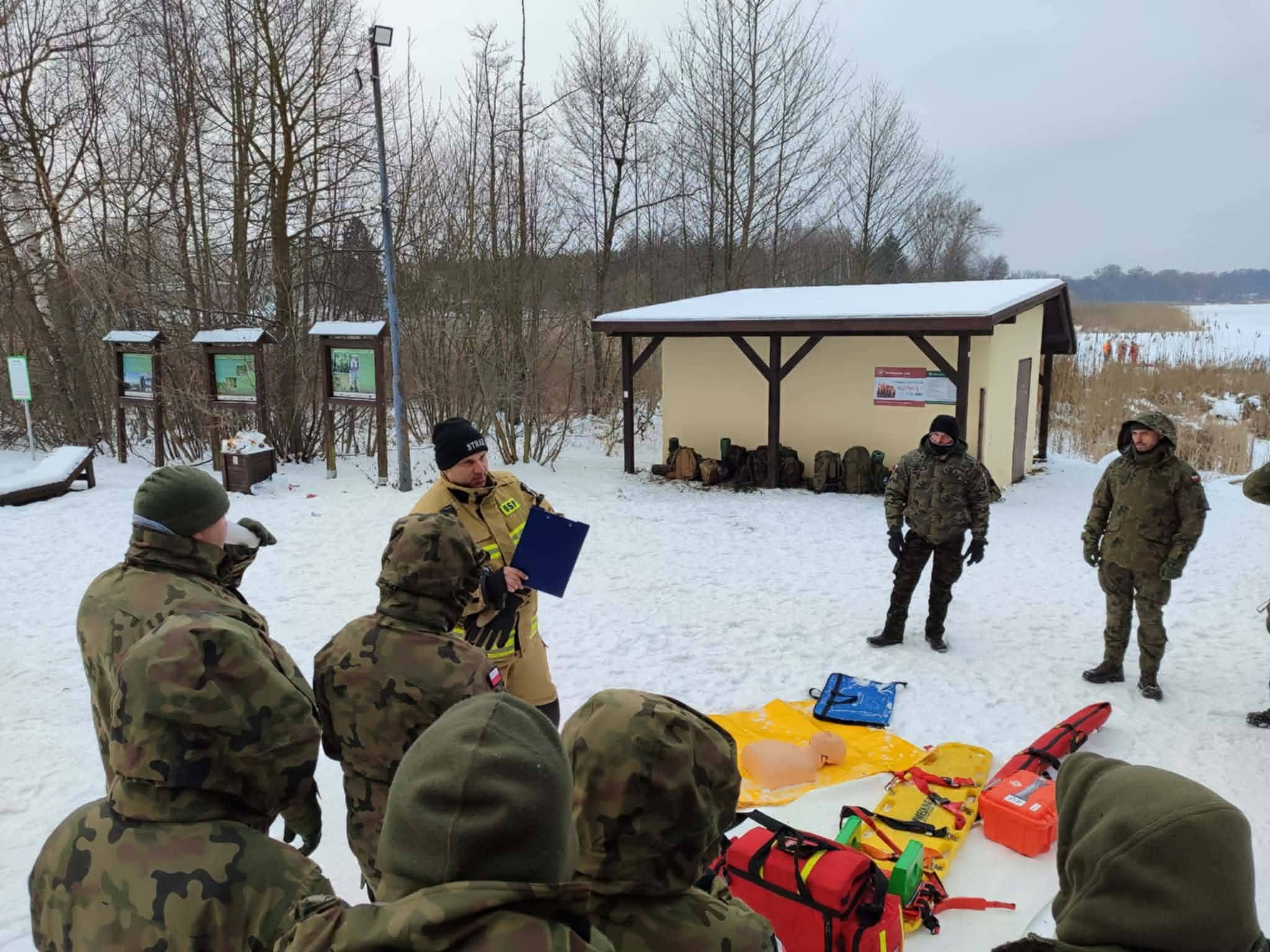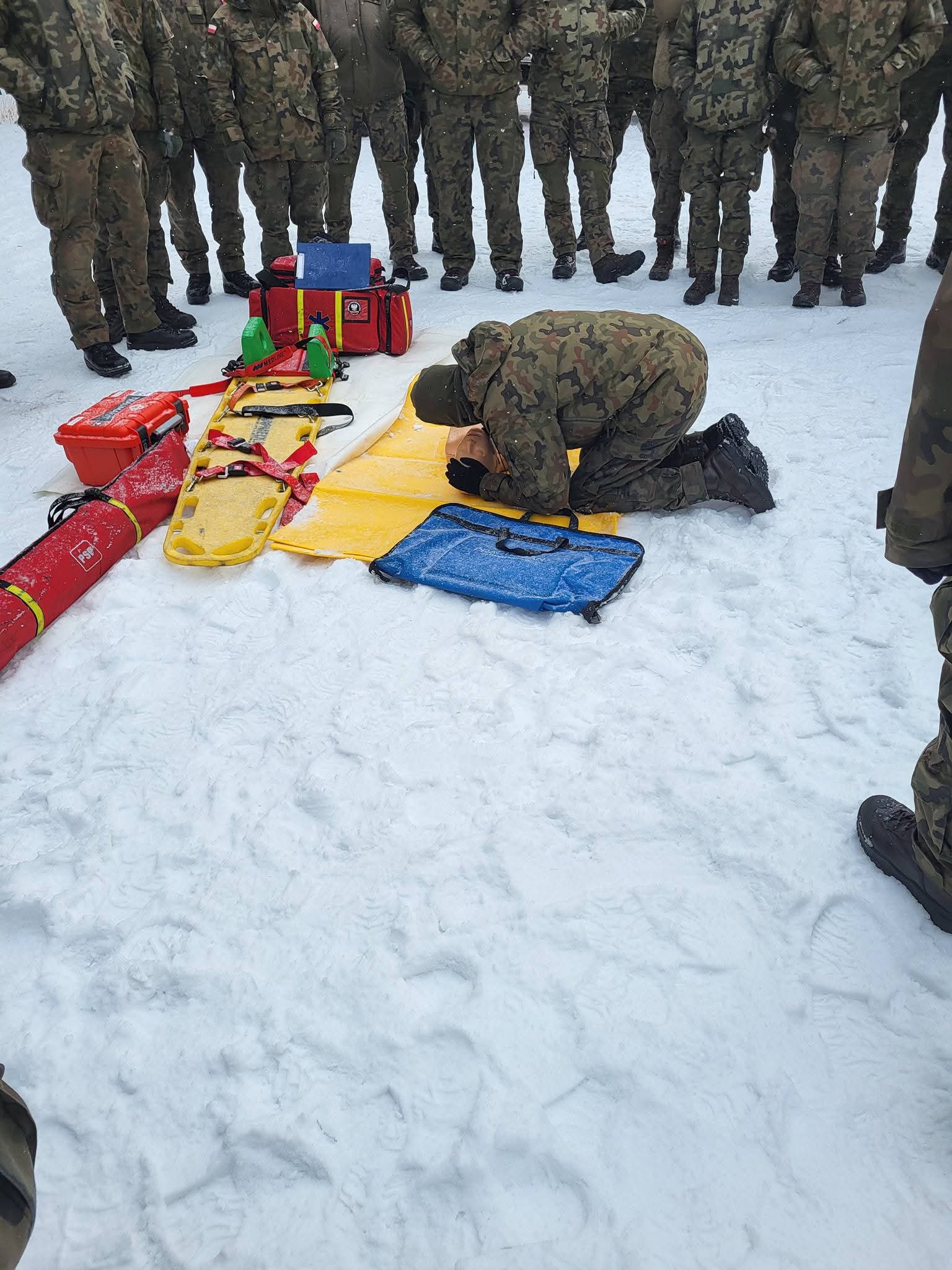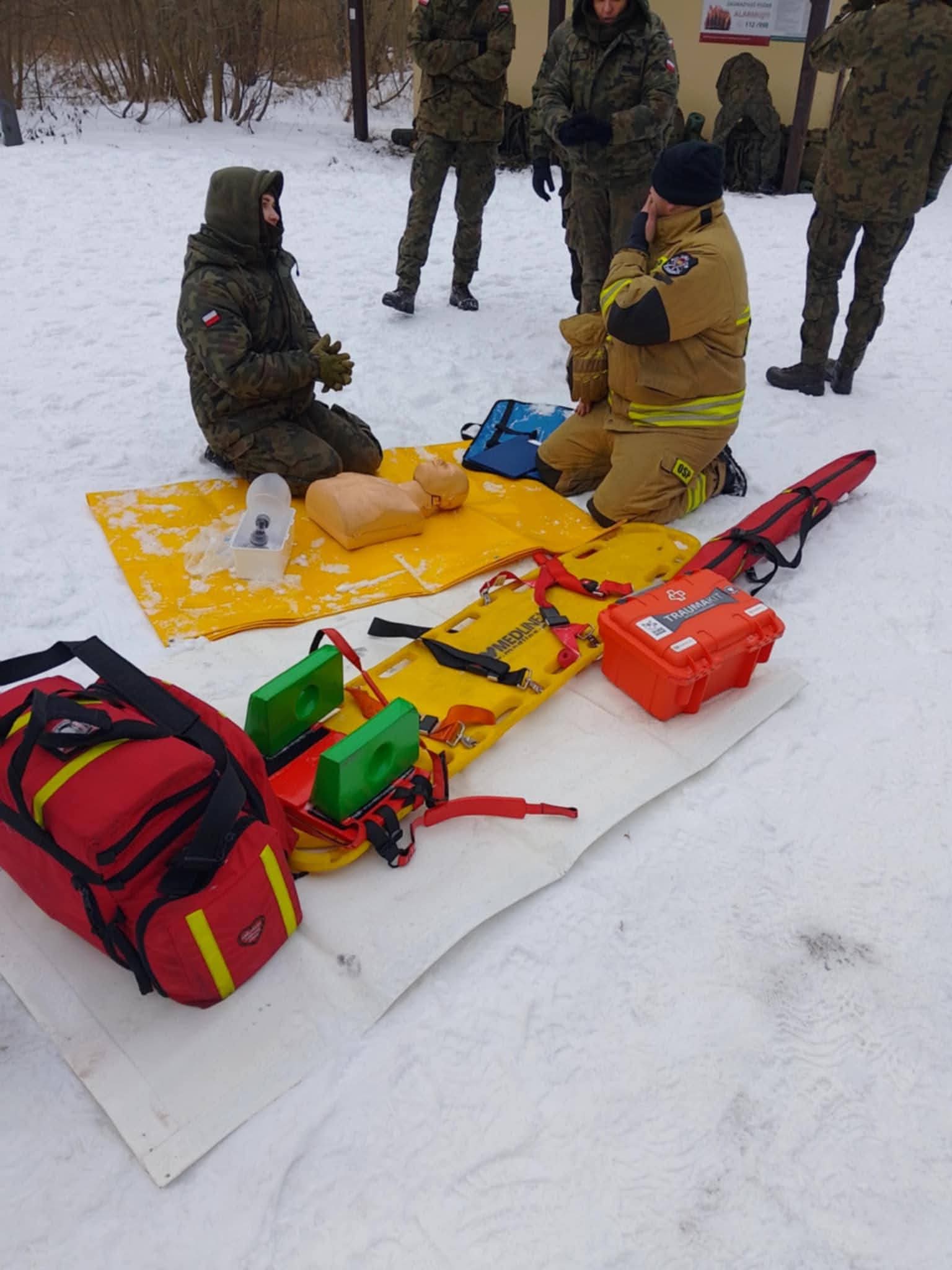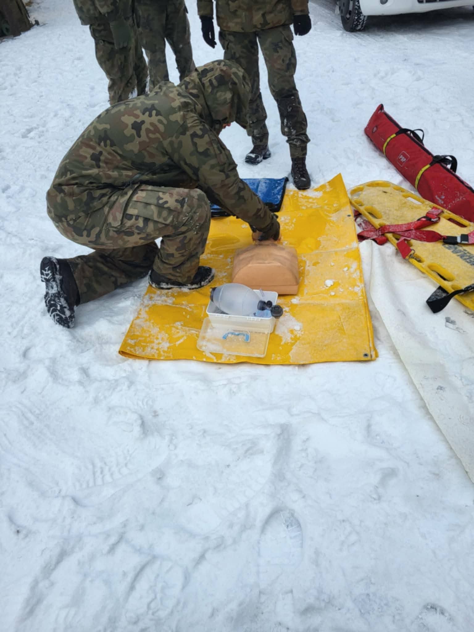 Drugie stanowisko stanowił punkt pierwszej pomocy. Omówiono tam przyczyny i objawy kolejnych stopni hipotermii oraz właściwe postępowanie ratunkowe. Uczestnicy wykonywali resuscytację krążeniowo‑oddechową, ćwiczyli stabilizację na desce ortopedycznej i bezpieczną ewakuację poszkodowanego. Szczególny nacisk położono na szybkie rozpoznanie stanu poszkodowanego, minimalizowanie dalszej utraty ciepła i przygotowanie do przekazania do zespołów medycznych.