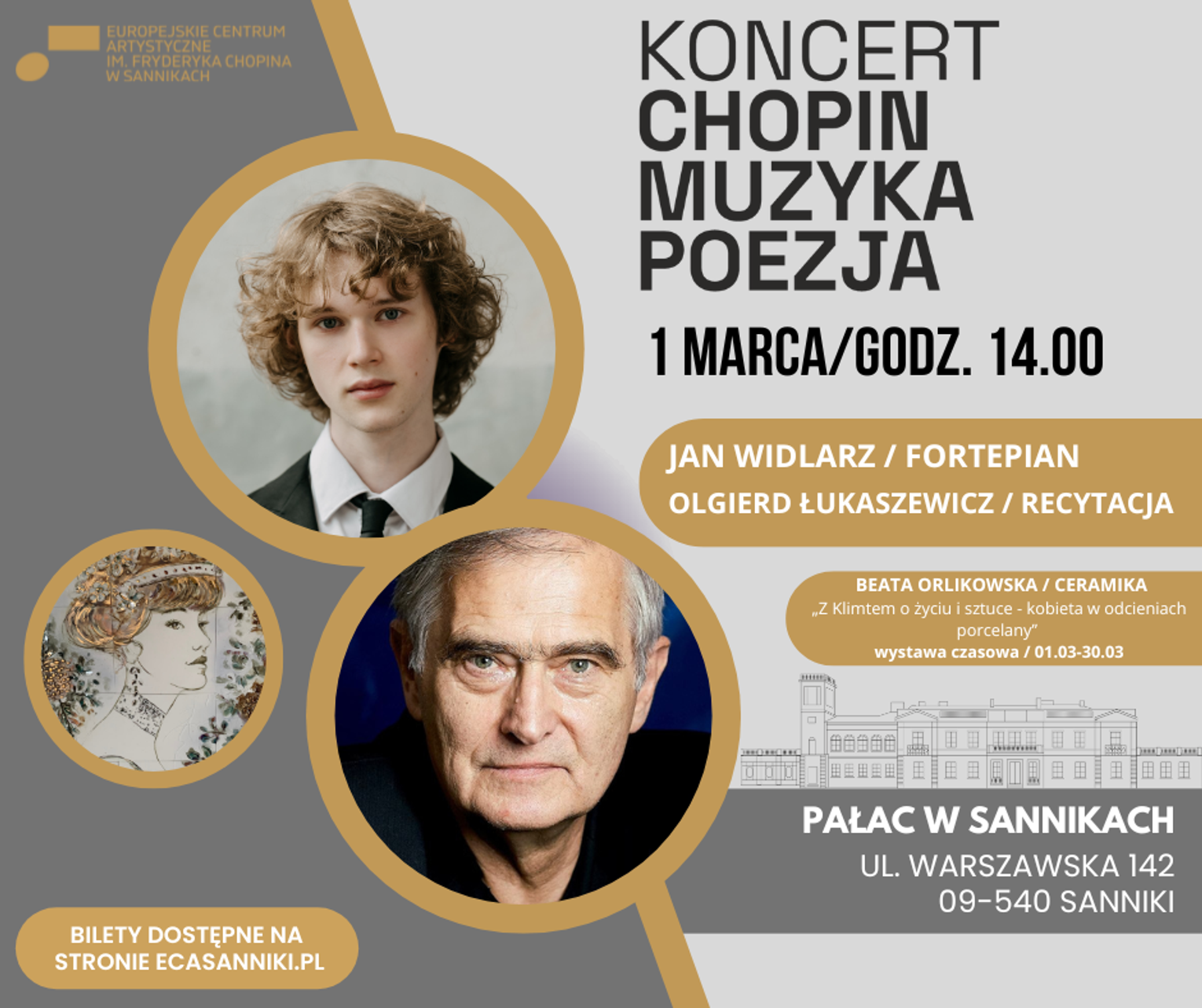 Wystąpią wybitny pianista Jan Widlarz oraz znany recytator Olgierd Łukaszewicz, którzy połączą swoje talenty, aby uczcić muzykę jednego z największych kompozytorów. Koncert obędzie się w ramach cyklu wydarzeń artystycznych organizowanych przez Europejskie Centrum Artystyczne im. Fryderyka Chopina. Dodatkowo, w tym samym czasie zagości wystawa ceramiki Beaty Orlikowskiej, odzwierciedlająca piękno sztuki i jej związek z życiem.