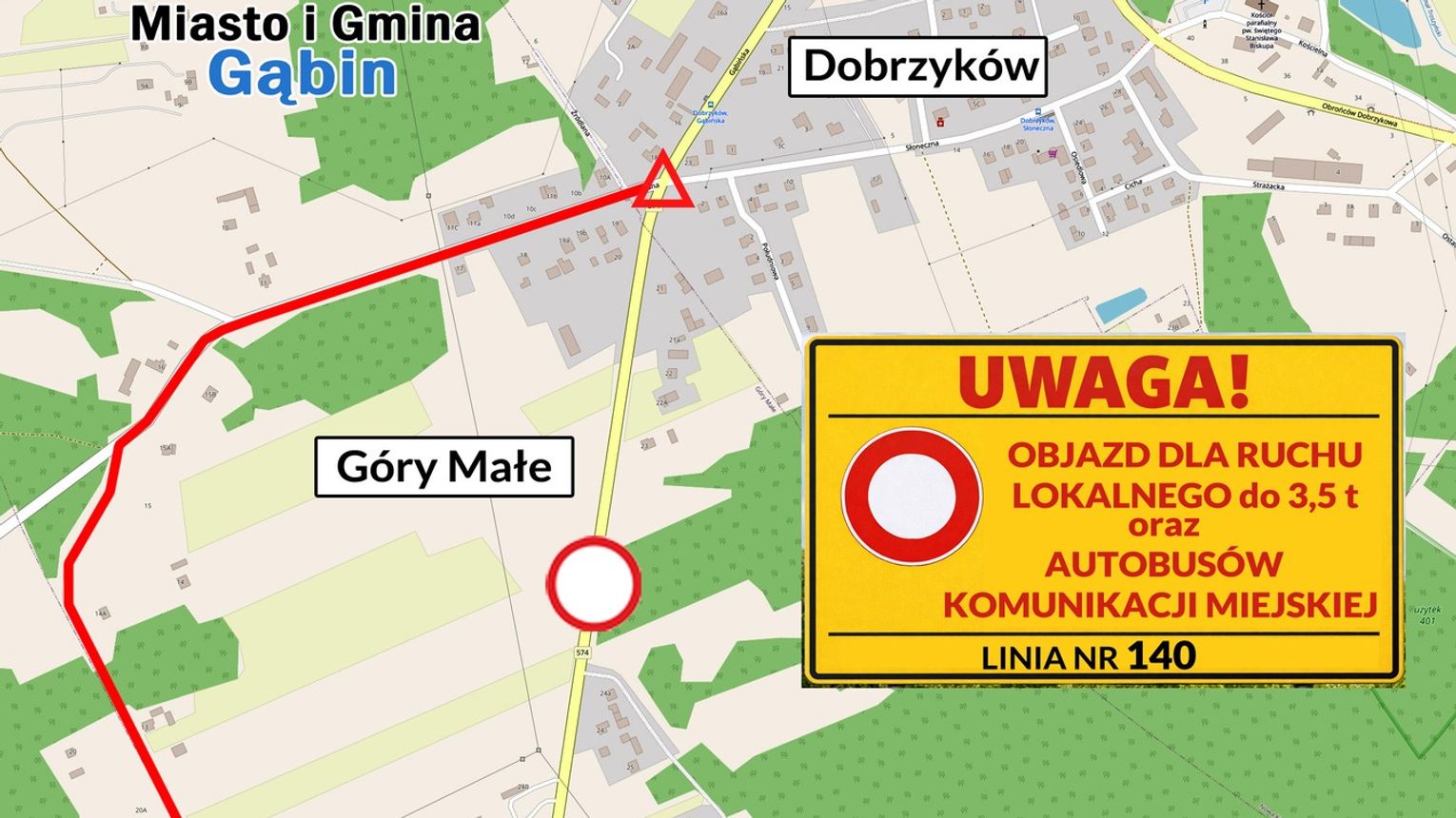 Miasto i Gmina Gąbin w porozumieniu z Komunikacją Miejską udostępnia na czas remontu drogę gminną. Będą nią mogły poruszać się samochody do 3,5 tony z wyłączeniem autobusów [linia 140]