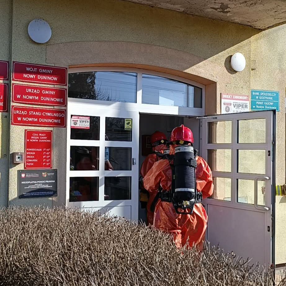 Z Urzędu Gminy Nowy Duninów wpłynęło zgłoszenie, że w jednym z pomieszczeń odnaleziono podejrzaną paczkę z opisem sugerującym obecność niebezpiecznych substancji chemicznych. Pan Wójt podjął decyzję o ewakuacji budynku, ewakuowano około 30 osób - przekazał oficer prasowy Komendanta Miejskiego Państwowej Straży Pożarnej w Płocku mł. kpt. Wojciech Pietrzak.