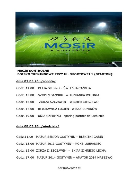 Mieszkańcy Gostynina oraz miłośnicy futbolu mają okazję do wspólnego sportowego przeżycia, ponieważ w dniach 7-8 marca 2026 roku odbędą się mecze kontrolne lokalnych drużyn na boisku przy ul. Sportowej 1.