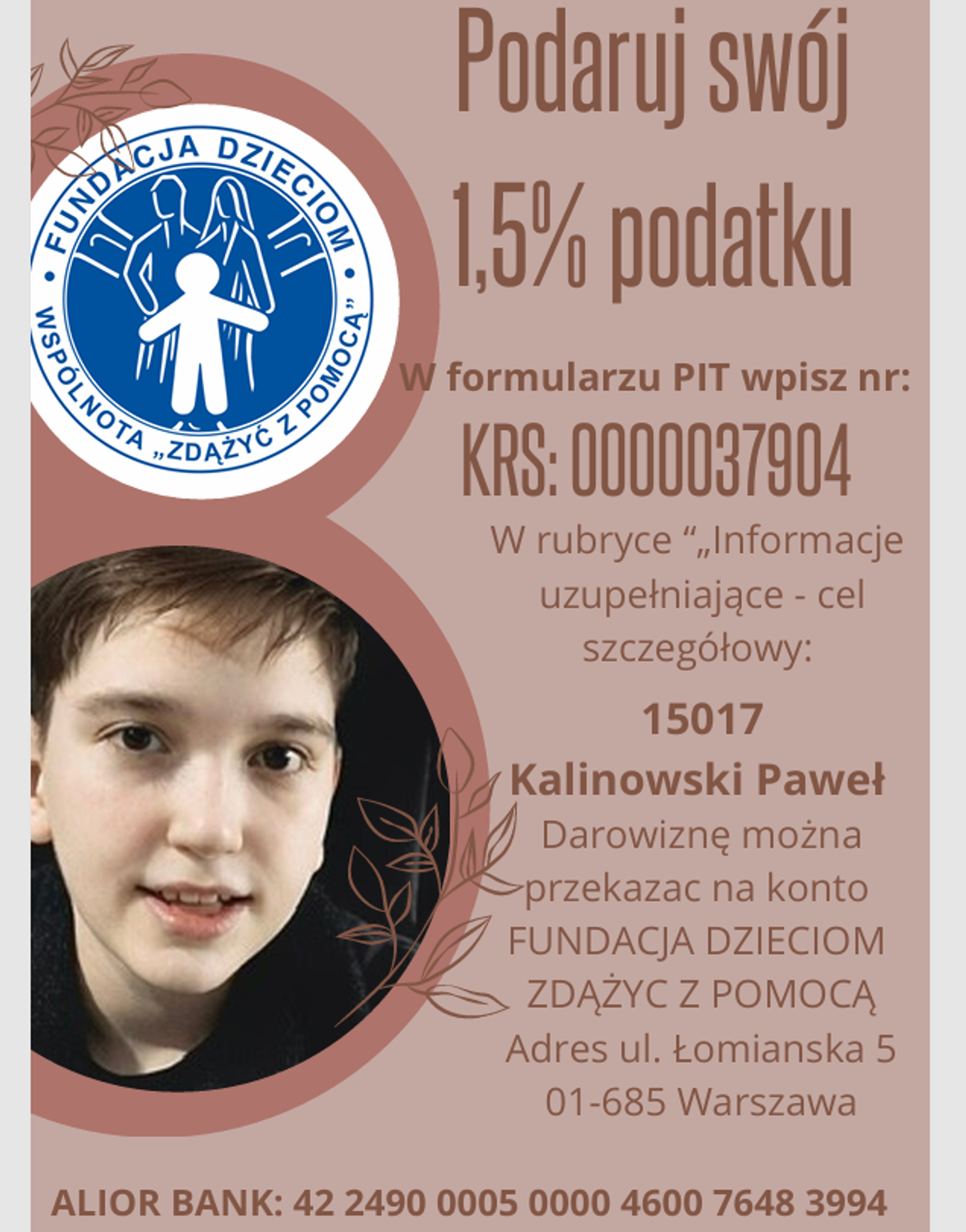 Przekazując 1,5 proc. swojego podatku dochodowego, możemy wspierać działania, które dają nadzieję i szansę na lepsze jutro. W formularzu PIT wystarczy wpisać numer KRS: 0000037904 oraz w rubryce „Informacje uzupełniające – cel szczegółowy” wpisz: 15017 Kalinowski Paweł, aby darowizna trafiła do konkretnego dziecka.