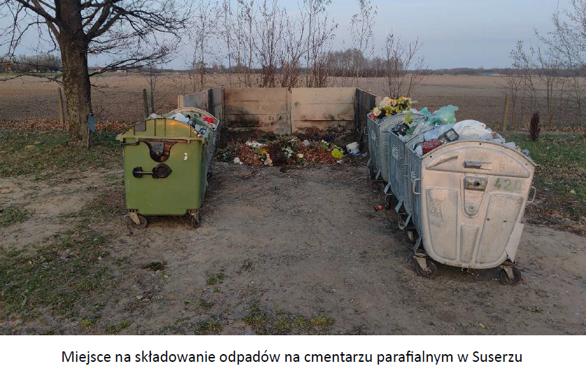 Ostatni wywóz odpadów miał miejsce przed świętem Wszystkich Świętych. Od tamtego czasu przepełnione kontenery urosły do skandalicznych rozmiarów. Podczas organizacji chociażby pochówku na miejscowym cmentarzu, pobierana jest tzw. „opłata od śmieci”. Podczas ostatnich wizyt duszpasterskich, parafianie składali ofiarę do dwóch kopert, zgodnie z wolą księdza – jedna: na kościół, druga: „na kolędę”. Rodzi się zatem pytanie: Na co były przeznaczane pieniądze parafian, skoro jeden z podstawowych obowiązków, jak czystość na parafialnym cmentarzu, nie jest realizowany. Czy potrzebna była trzecia koperta – na cmentarz?